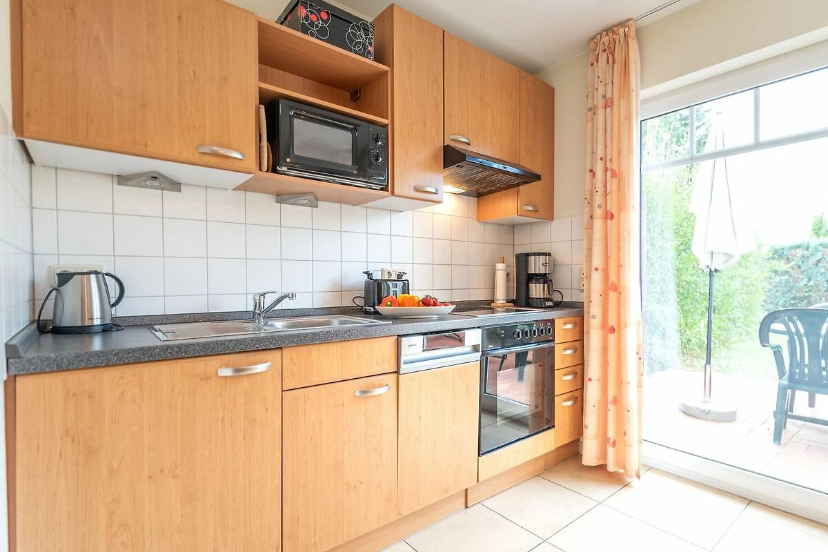 Der grosszügige, geflieste Wohnraum ist freundlich gestaltet und verfügt über eine vollständig ausgestattete Küchenzeile, die alle wichtigen Utensilien für die Zubereitung eigener Mahlzeiten bereithält.