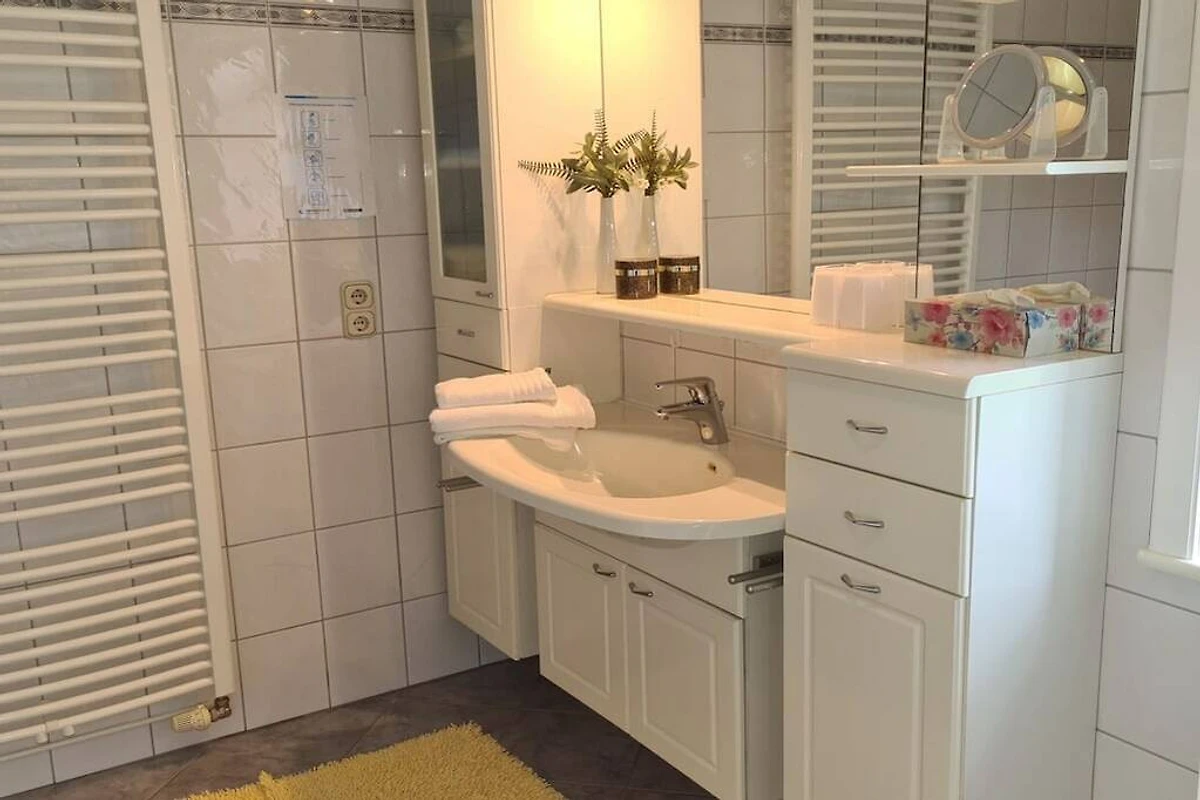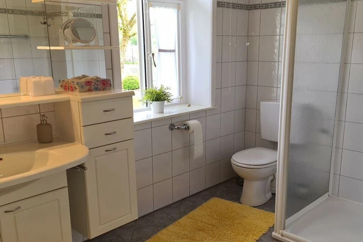 Im Bad befindet sich eine Dusche, Toilette, Spiegelschrankwand und Waschbecken. Ein Fön ist vorhanden.