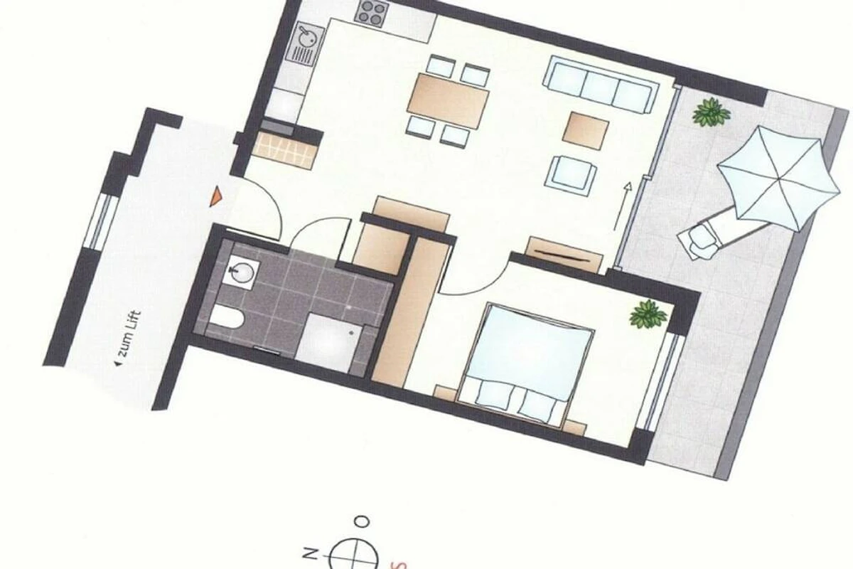 Großes Wohnzimmer mit Essbereich sowie komplett ausgestatteter Wohnküche und Südbalkon/Terrasse. Separates Schlafzimmer mit Doppelbett und TV, Bad mit Dusche und WC, Fön, Tiefgarage und Fahrradraum.