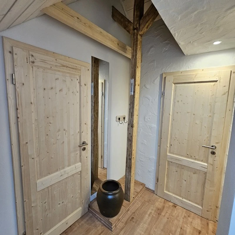 Über eine Holztreppe gelangt man ins Obergeschoss.