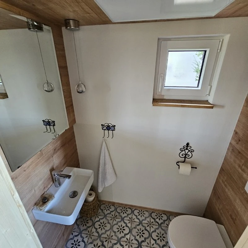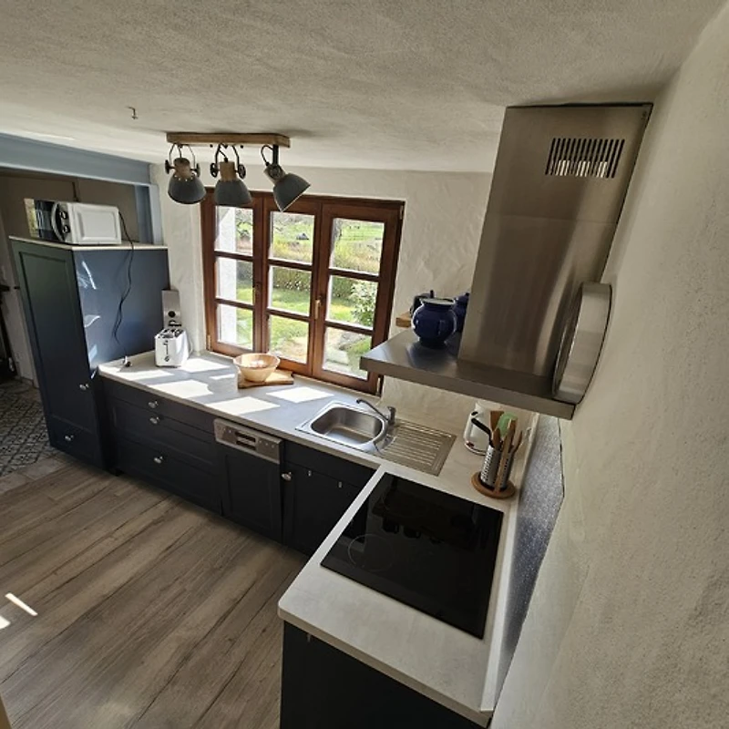 Es gibt zwei Schlafzimmer, ein Du/Bad, extra WC, ein Wohn-Essbereich und die offene Küche. Hüttenfeeling verspricht unser Holzofen.