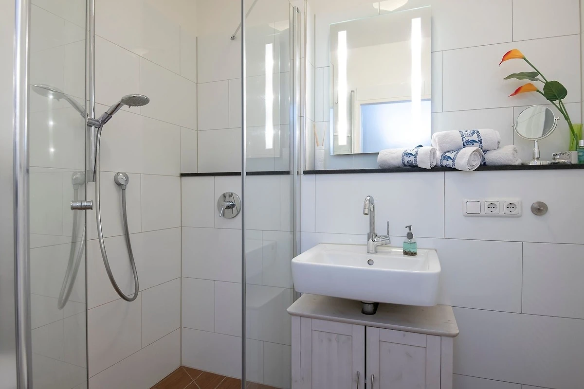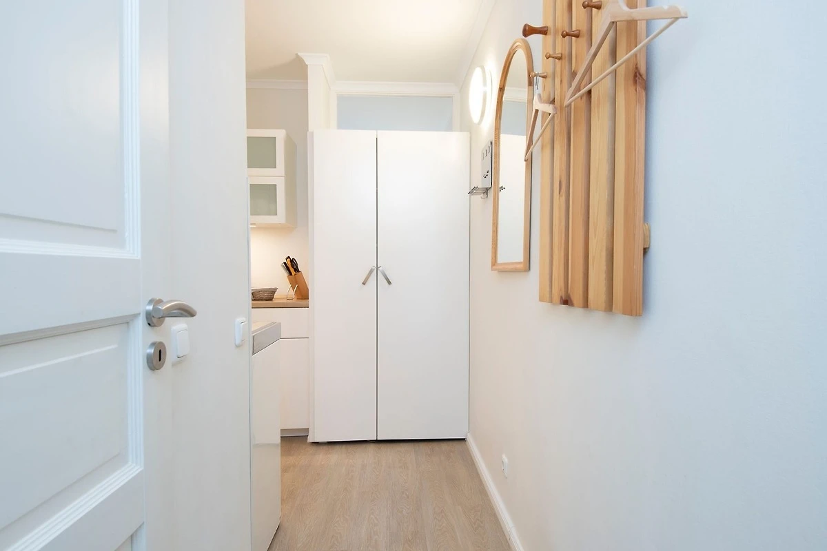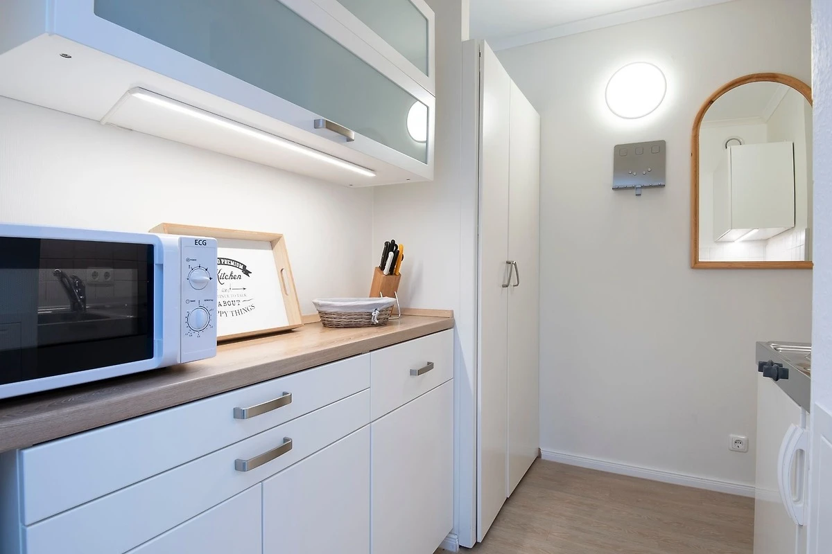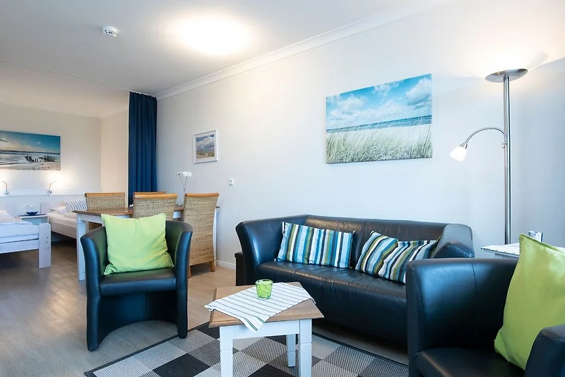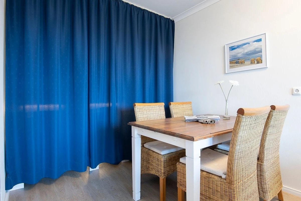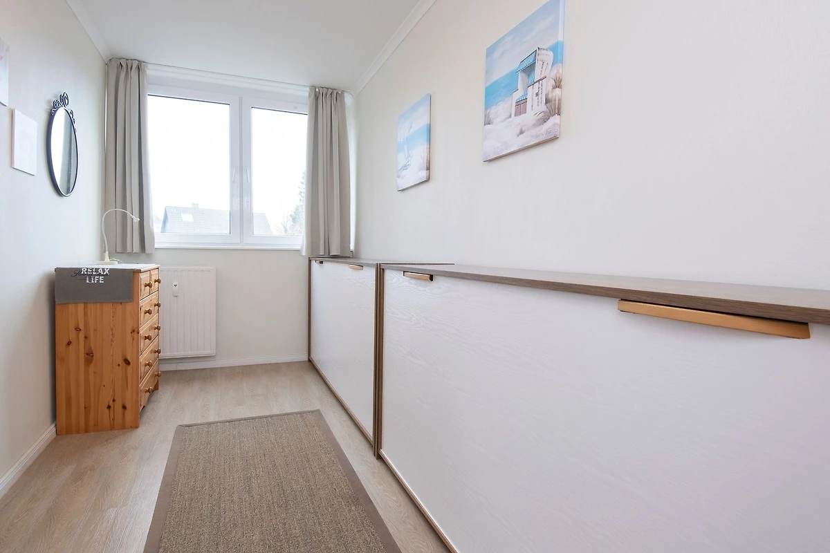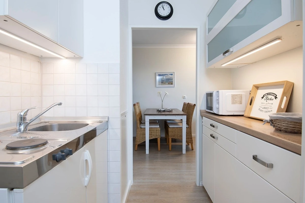Im hellen Wohnbereich mit komfortabler Sofalandschaft, TV und behaglichem Essbereich trifft sich die ganze Familie zum Spielen, Relaxen, Essen, oder zum Filmeabend. Über den kostenlosen WLAN-Anschluss sind Sie auch im Urlaub erreichbar und die Kinder können ihre Lieblingsmusik oder -hörspiele streamen. Auch ein DAB plus Radio mit CD-Player und Bluetooth- Funktion sorgt für Unterhaltung. Von hier gelangen Sie auch auf den möblierten Balkon, auf dem Sie bei Sonnenschein ein ausgiebiges Frühstück an der gesunden Ostseeluft geniessen können. Vom Wohnbereich, durch einen Vorhang abgetrennt, laden zwei separate Einzelbetten (je 90x200 cm) zum Träumen ein. In einem weiteren separaten Schlafzimmer befinden sich zwei platzsparende einklappbare Einzelbetten (je 90x200 cm), so ist tagsüber genügend Platz zum Spielen vorhanden. Ein Kleiderschrank bietet Stauraum für die mitgebrachte Urlaubsgarderobe. Die offene, kleine Küche verfügt über ein kleines Mikrowellen/Backofen-Kombigerät, einen Herd mit 2 Kochplatten, einen Kühlschrank und andere Annehmlichkeiten, so dass Sie sich während des Urlaubs auch selbst verpflegen können. Das Duschbad wurde komplett saniert und Dank der bodentiefen Dusche können Sie erfrischt in den Tag starten.
