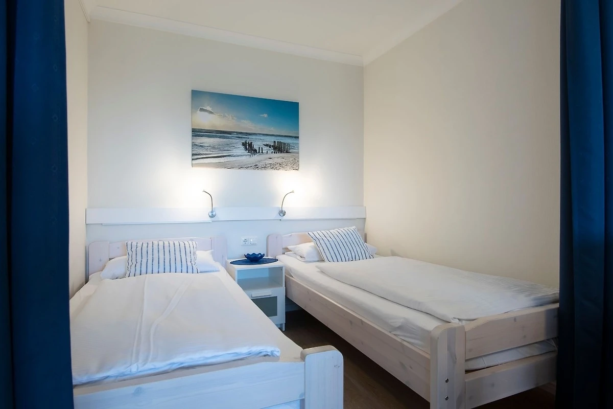 Wohn/ Schlafraum: 2 Einzelbetten (2x 90x200 cm), durch Vorhänge abgetrennt