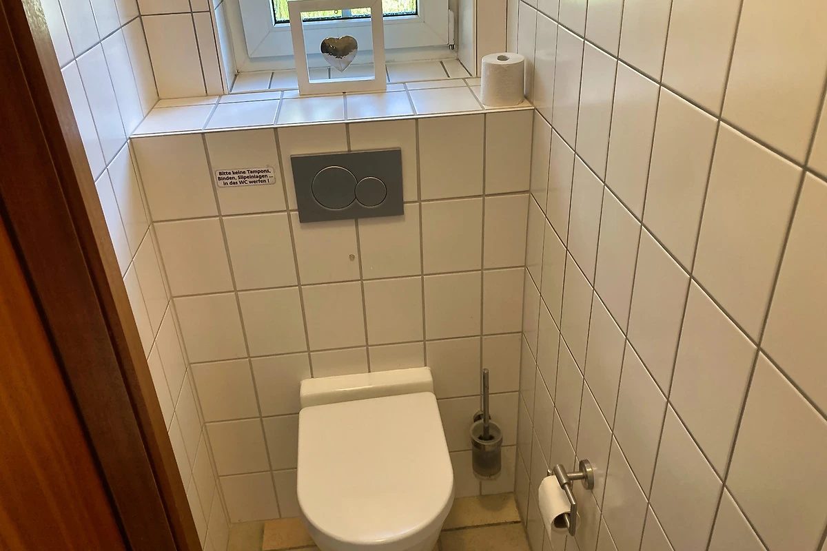 Das moderne Bad verfügt über eine Dusche, WC, Waschbecken und Spiegel - zusätzlich steht ein separates Gäste-WC zur Verfügung.