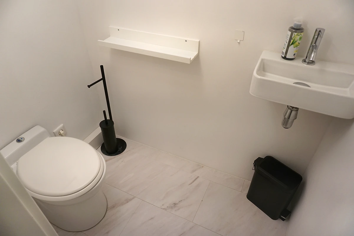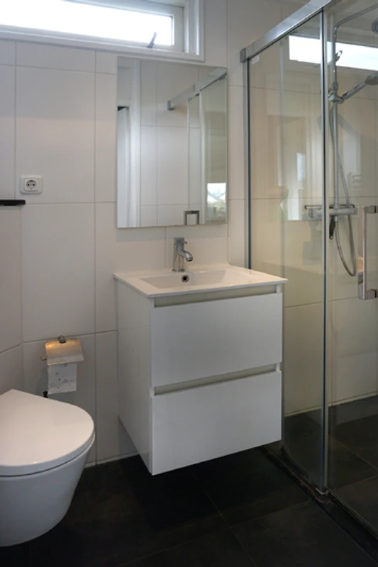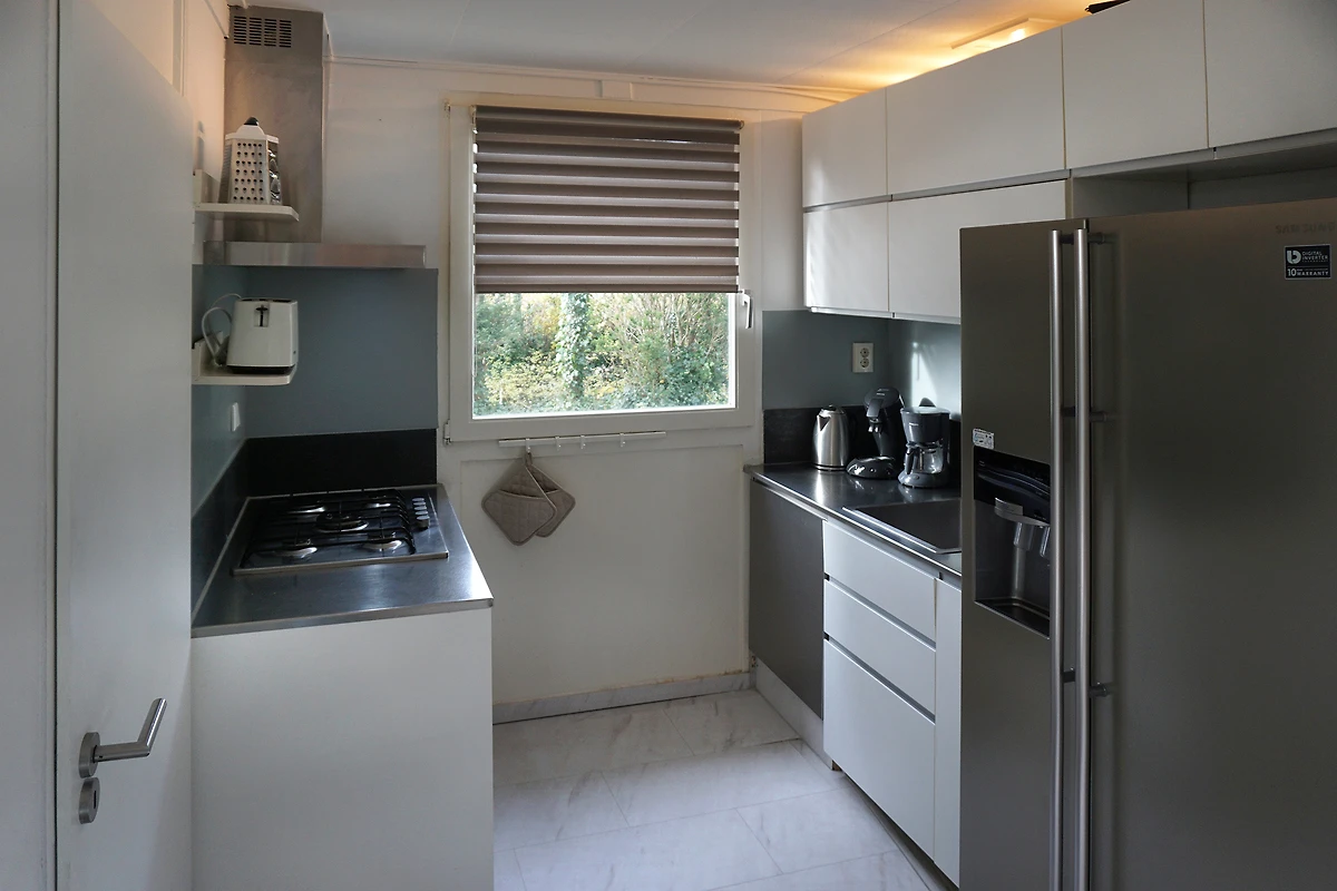 Die halboffene Küche ist mit einem 4-Flammen-Gasherd, einem Kühl-/Gefrierschrank, einem Geschirrspüler und einem Backofen ausgestattet. Toaster, Wasserkocher und eine Senseo-Kaffeemaschine sind ebenfalls vorhanden. Das kompakte Badezimmer verfügt über eine ebenerdige Dusche, WC und Badezimmermöbel. Im Flur befinden sich eine Waschmaschine und ein Trockner.