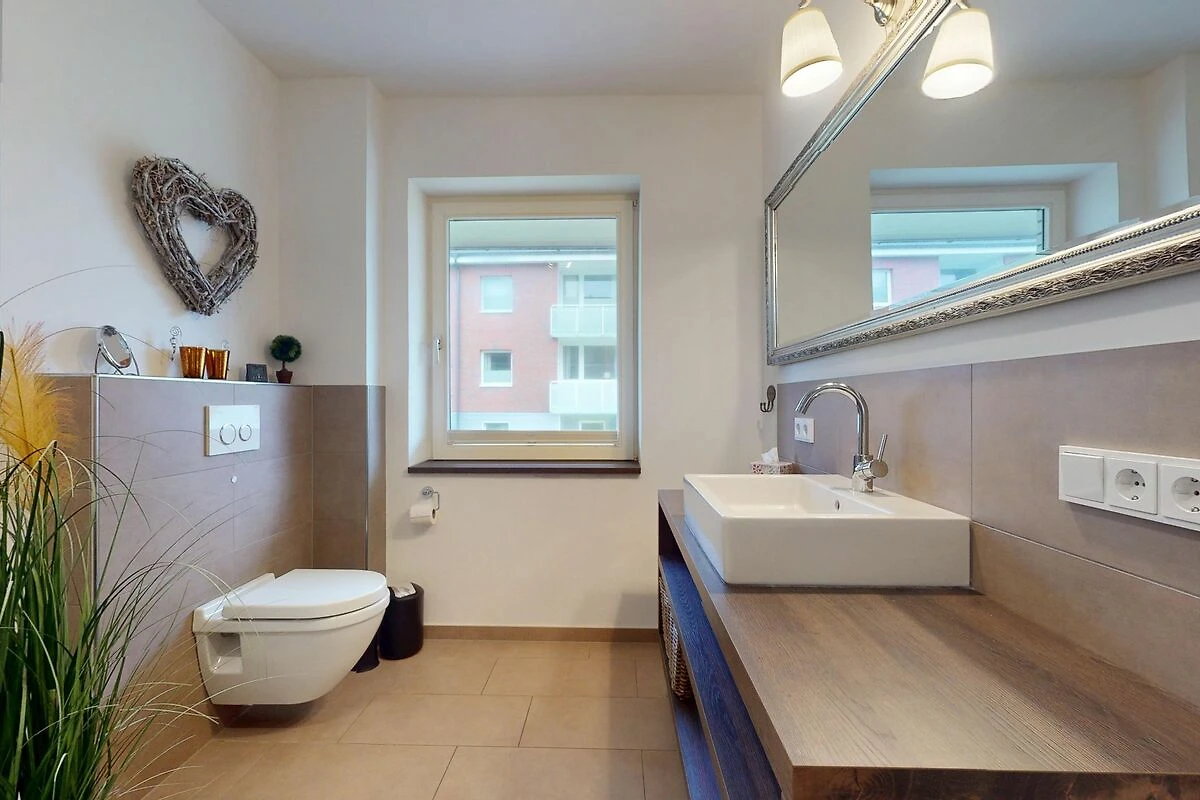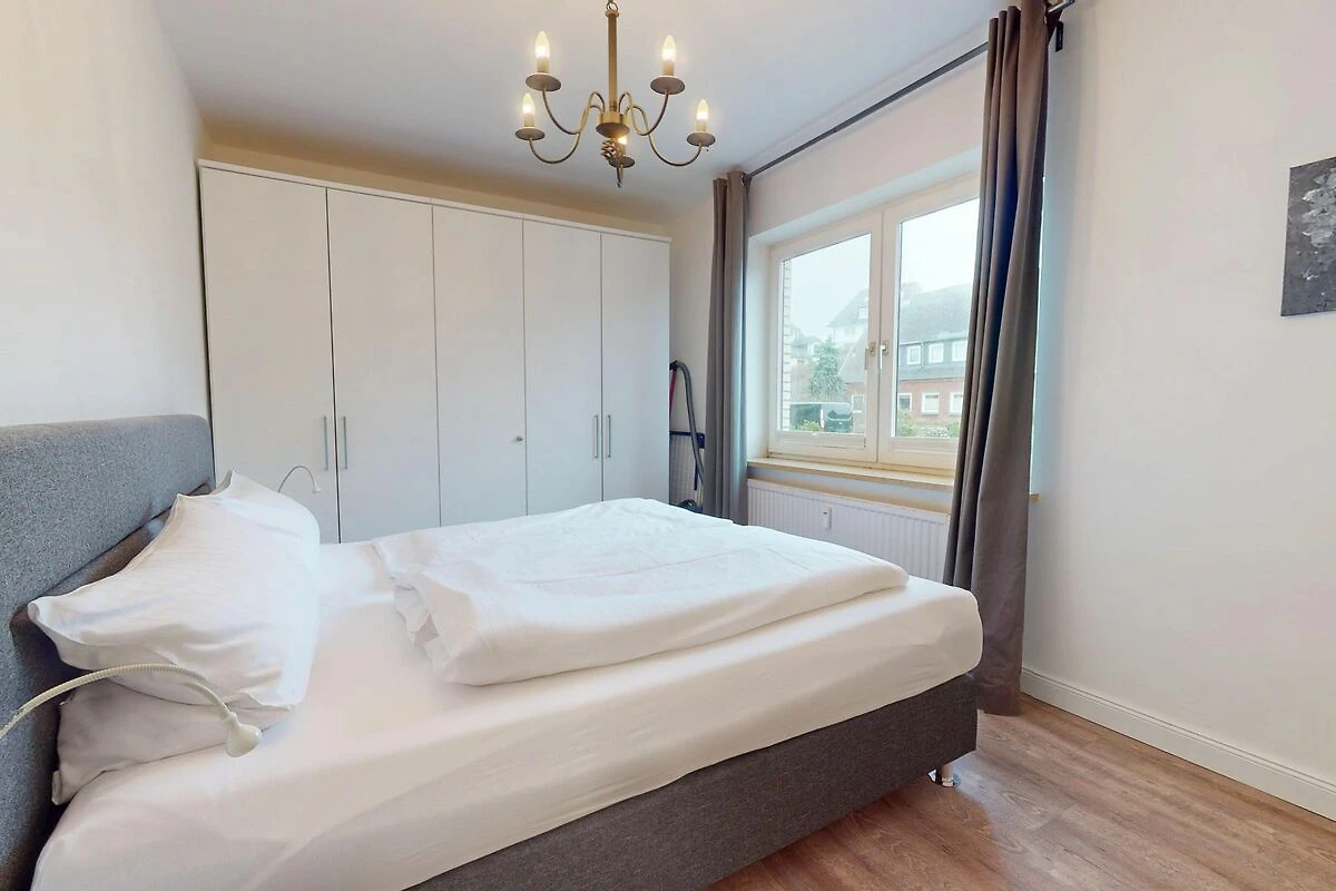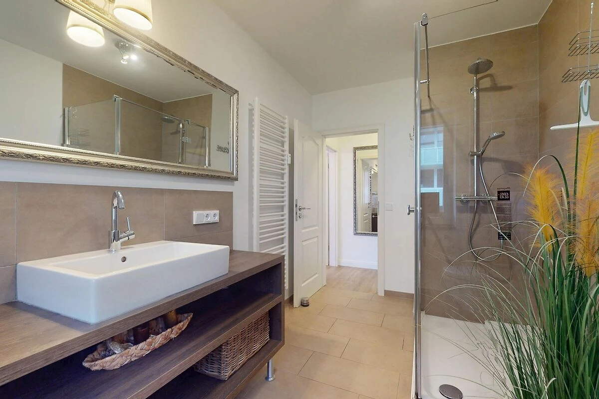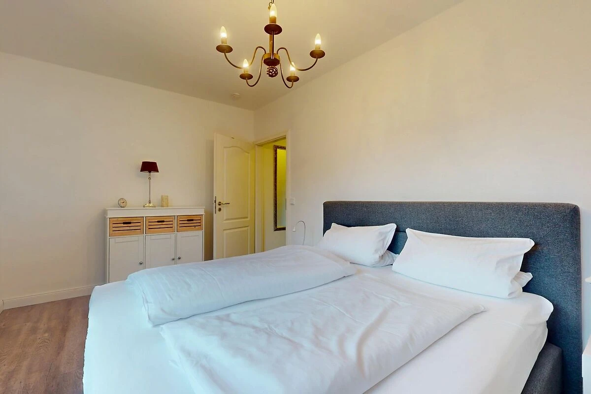 Im Schlafzimmer sorgt ein komfortables Boxspringbett für erholsamen Schlaf, das Bad mit Regendusche für einen erfrischenden Start in den Tag.