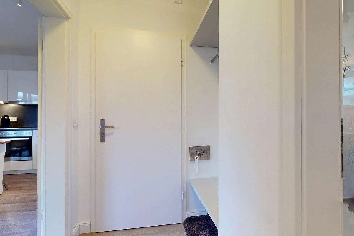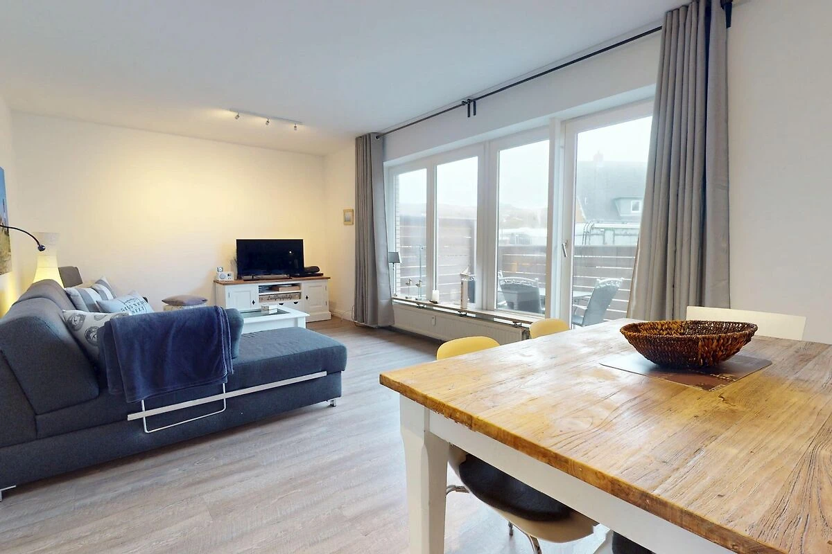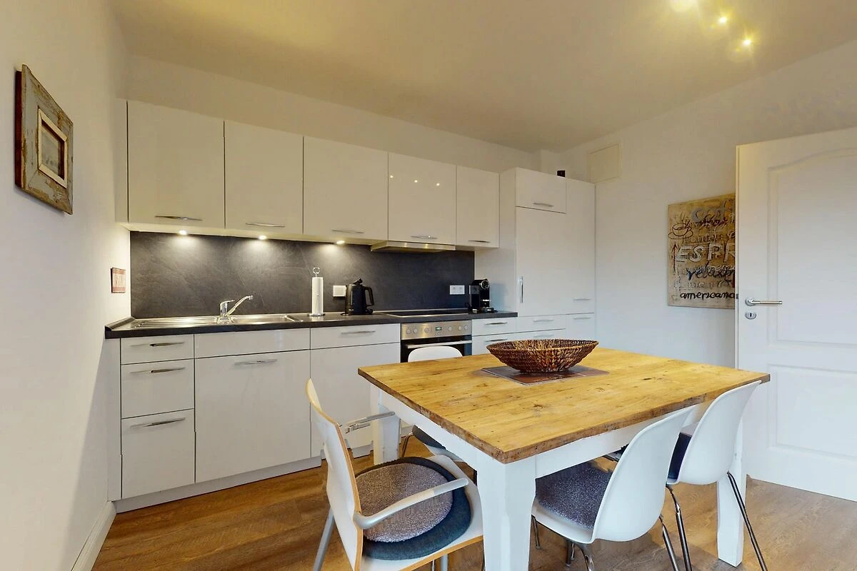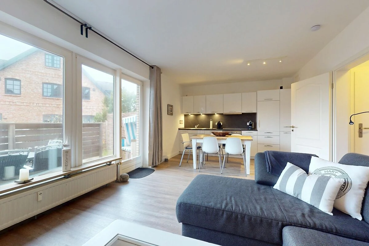 Die Hoernem Stuuv befindet sich im Hoernem Hüs, im Erdgeschoss und ist bequem über wenige Stufen erreichbar. Der offene Wohnbereich mit Küche und Essbereich lädt zum Entspannen, Kochen und gemeinsamen Genießen ein. Auf der großzügigen Süd/West-Terrasse können Sie die Sonne von morgens bis abends genießen – ob beim Frühstück, im Strandkorb oder bei einem Glas Wein am Abend.