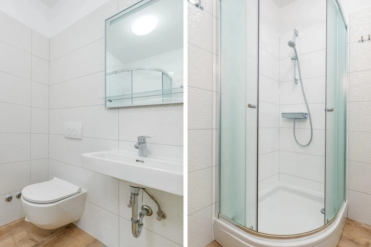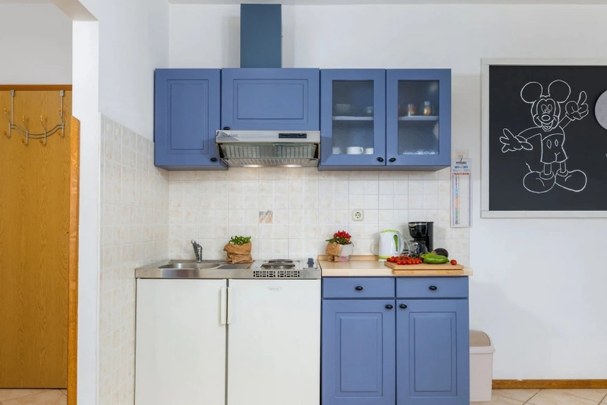 Die Wohnung verfügt über ein gut ausgestattetes Schlafzimmer mit Doppelbett, das einen erholsamen Schlaf gewährleistet. Das einzelne Badezimmer ist mit einer praktischen Dusche ausgestattet und bietet alle notwendigen Annehmlichkeiten für einen komfortablen Aufenthalt. Eine amerikanische Küche mit Glaskeramik-Kochfeld ist vollständig ausgestattet mit einem Kühlschrank, essentiellen Küchenutensilien, einer Kaffeemaschine und Geschirr, sodass Gäste einfache Mahlzeiten zubereiten und die heimelige Bequemlichkeit geniessen können.