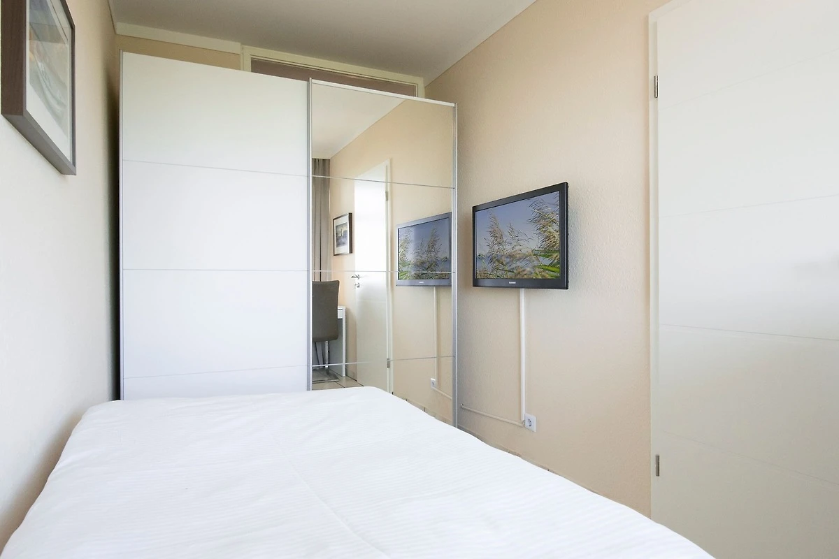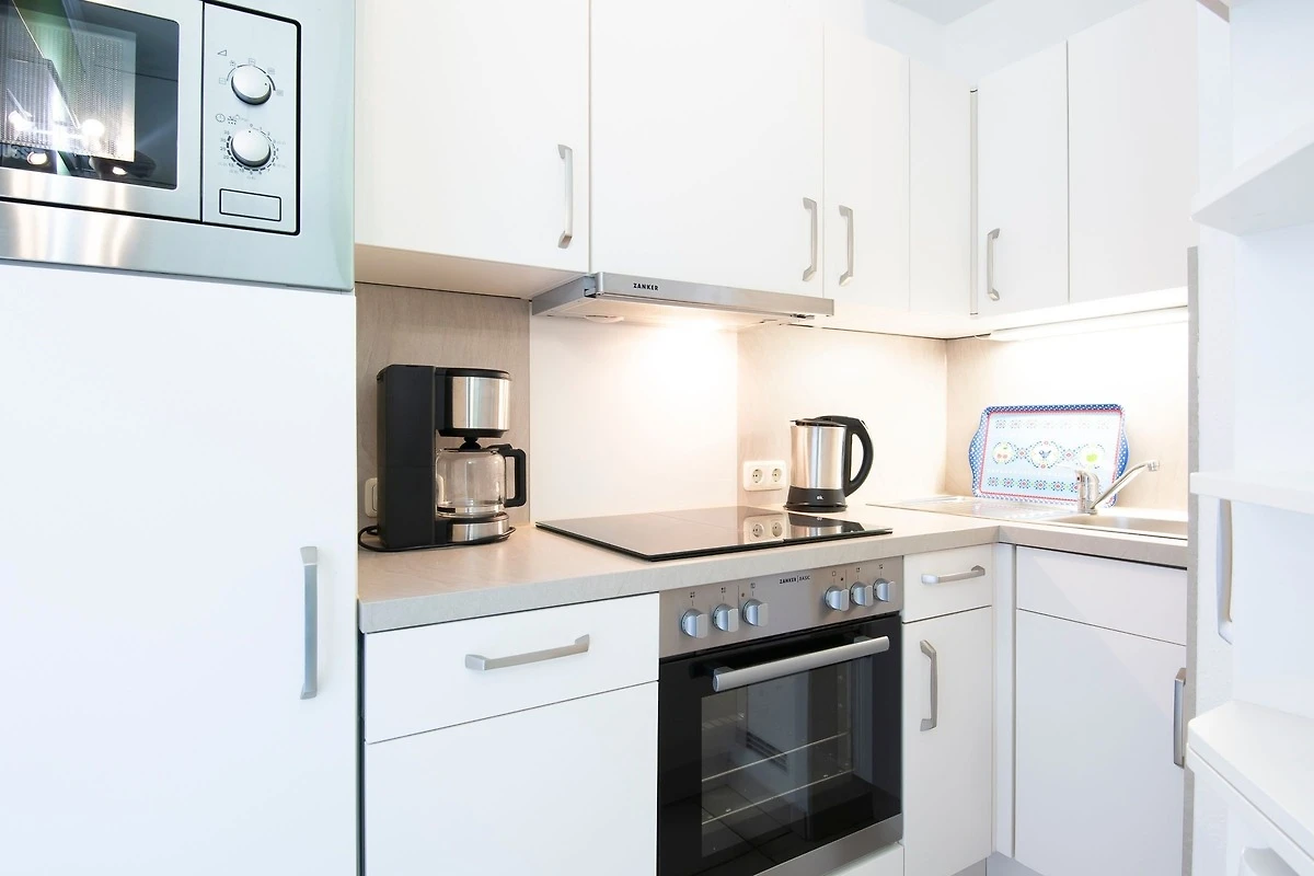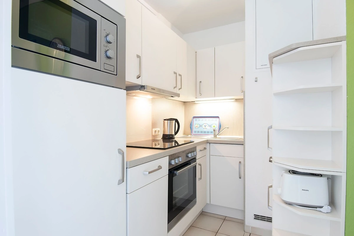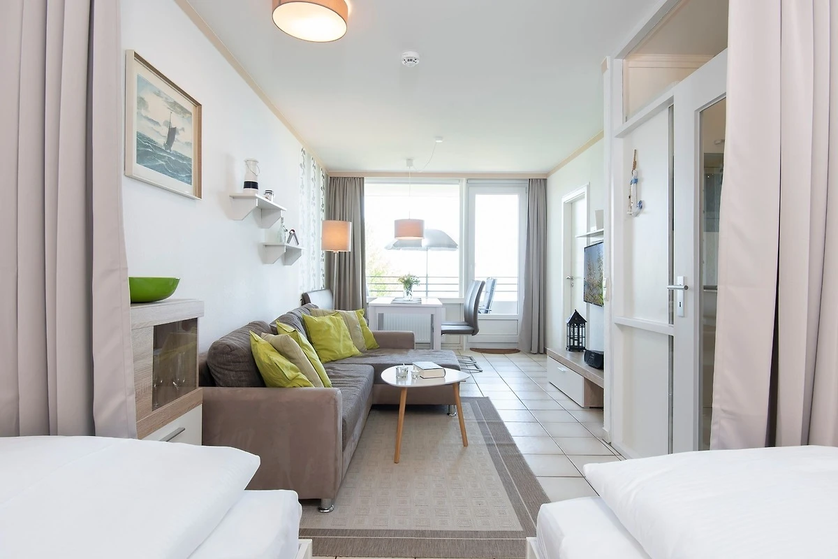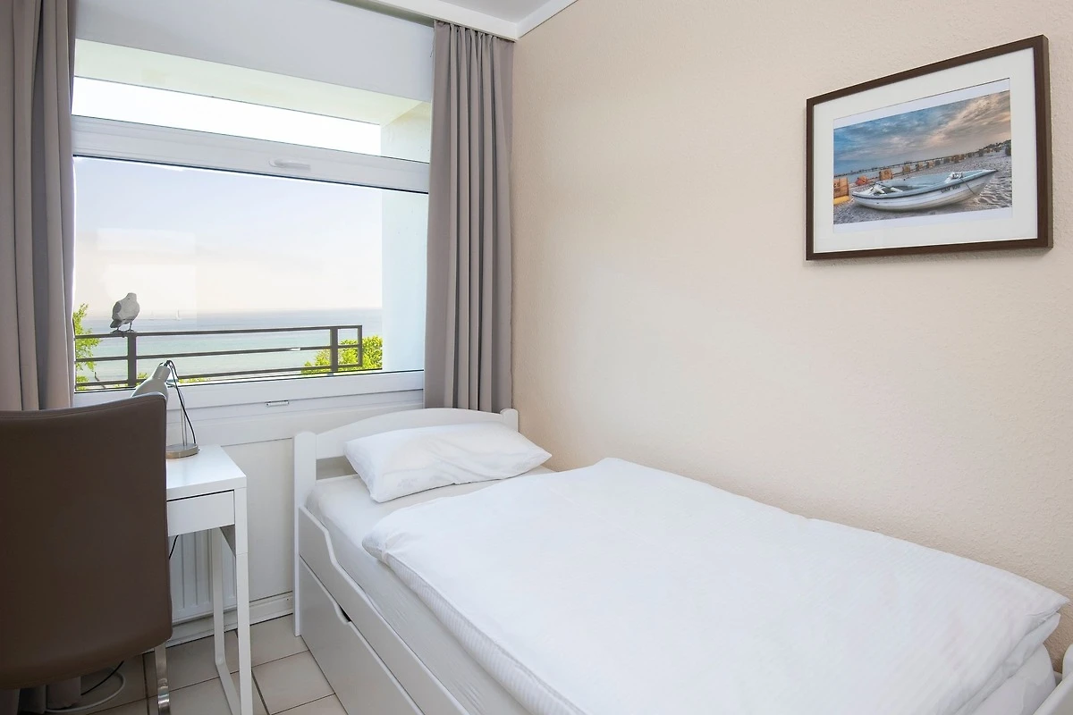 Lust auf Ostseeblick? Dann sind Sie hier genau richtig! Der helle, moderne Wohn-/Schlafbereich bildet den Mittelpunkt dieser schönen Ferienwohnung. Verbringen Sie entspannte Stunden vor dem Flachbild-TV auf dem gemütlichen Ecksofa oder geniessen Sie ein leckeres Essen am Esstisch mit Blick auf das Meer. Durch Vorhänge abgegrenzt finden Sie 2 Einzelbetten (2x 90x200 cm), die zum Schlafen und Träumen einladen. Bei Bedarf kann ein Urlaubsgast in ein Einzelbett (90x200 cm) in das separate Schlafzimmer ausweichen. Hier steht auch ein Kleiderschrank für Ihre Urlaubsgarderobe. In der separaten, gut ausgestatteten Küche mit Geschirrspüler finden Sie alles, um sich im Urlaub selbst zu verwöhnen. Ein gepflegtes Duschbad (exkl. Waschmaschine) komplettiert die Ausstattung dieser niedlichen Ferienwohnung.