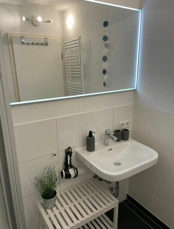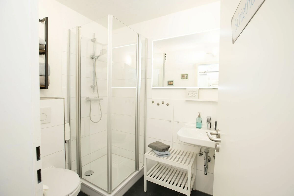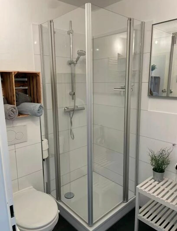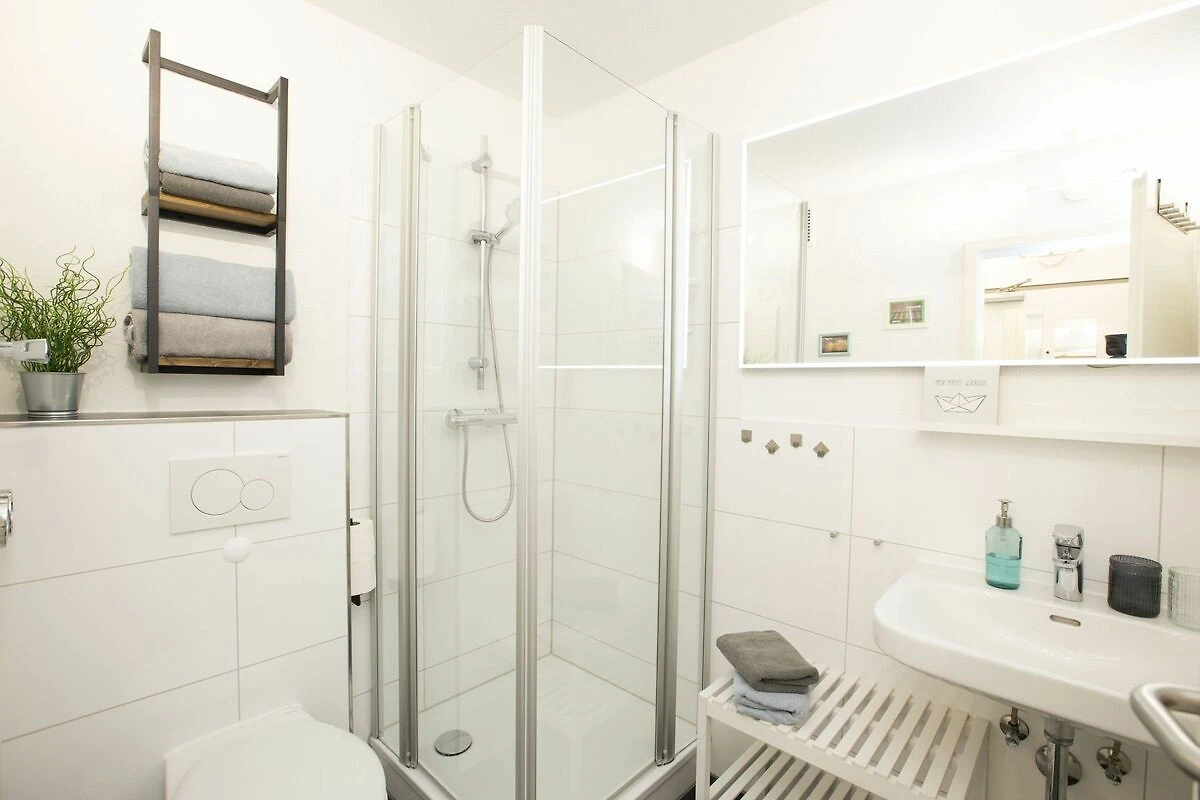 Das hochwertig ausgestattete Duschbad verfügt über ein WC und ein Waschbecken mit Spiegel sowie Haartrockner. Bettwäsche, Handtücher und Badetücher sind als Erstausstattung bereits vorhanden. Für den Alltag stehen Ihnen zudem ein gemeinschaftlich nutzbarer Waschmaschinenraum, Wäscheständer sowie Staubsauger zur Verfügung.