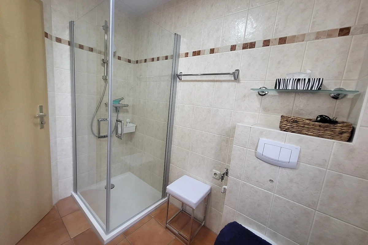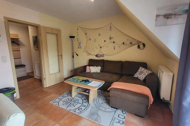 Wohn- Küchenkombination mit getrenntem Sitz- und Essbereich. Zwei Schlafräume mit Doppelbetten, Kommoden und Kleiderschränken. Badezimmer ist mit Dusche, Waschtisch und WC ausgerüstet.