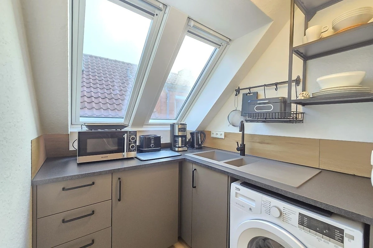 Das Ferienappartement Turmblick in Marienhafe bietet modernen Komfort für 2 Personen in zentraler Lage. Die hellen und stilvoll eingerichteten Räume schaffen eine entspannte Urlaubsatmosphäre. Eine voll ausgestattete Küche ermöglicht es, eigene Mahlzeiten zuzubereiten, während der komfortable Wohnbereich zu gemütlichen Stunden einlädt. Durch eine spezielle Schallisolierung ist eine ruhige Atmosphäre gewährleistet, obwohl sich das Appartement über einer beliebten Lokalität befindet. Im Erdgeschoss befindet sich ein Restaurant, das ein angenehmes Ambiente und regional spannende Speisen bietet. Gästen steht der Vorteil eines Rabatts auf Getränke und Speisen im Restaurant zur Verfügung. Einkaufsmöglichkeiten und Sehenswürdigkeiten sind in unmittelbarer Nähe, ideal für erkundungsfreudige Besucher.