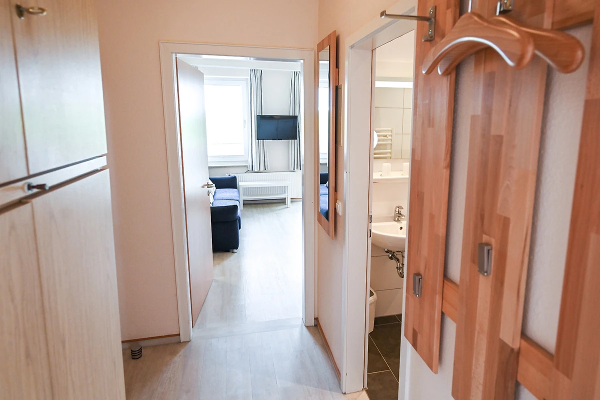 Unsere 2-Raum-Ferienwohnungen Nr.5 liegt in der Hochpaterre und hat einen Wohnschlafraum, einen Schlafraum, Küche, einen Balkon, Dusche/WC und ist für 2-3 Personen ausgestattet.