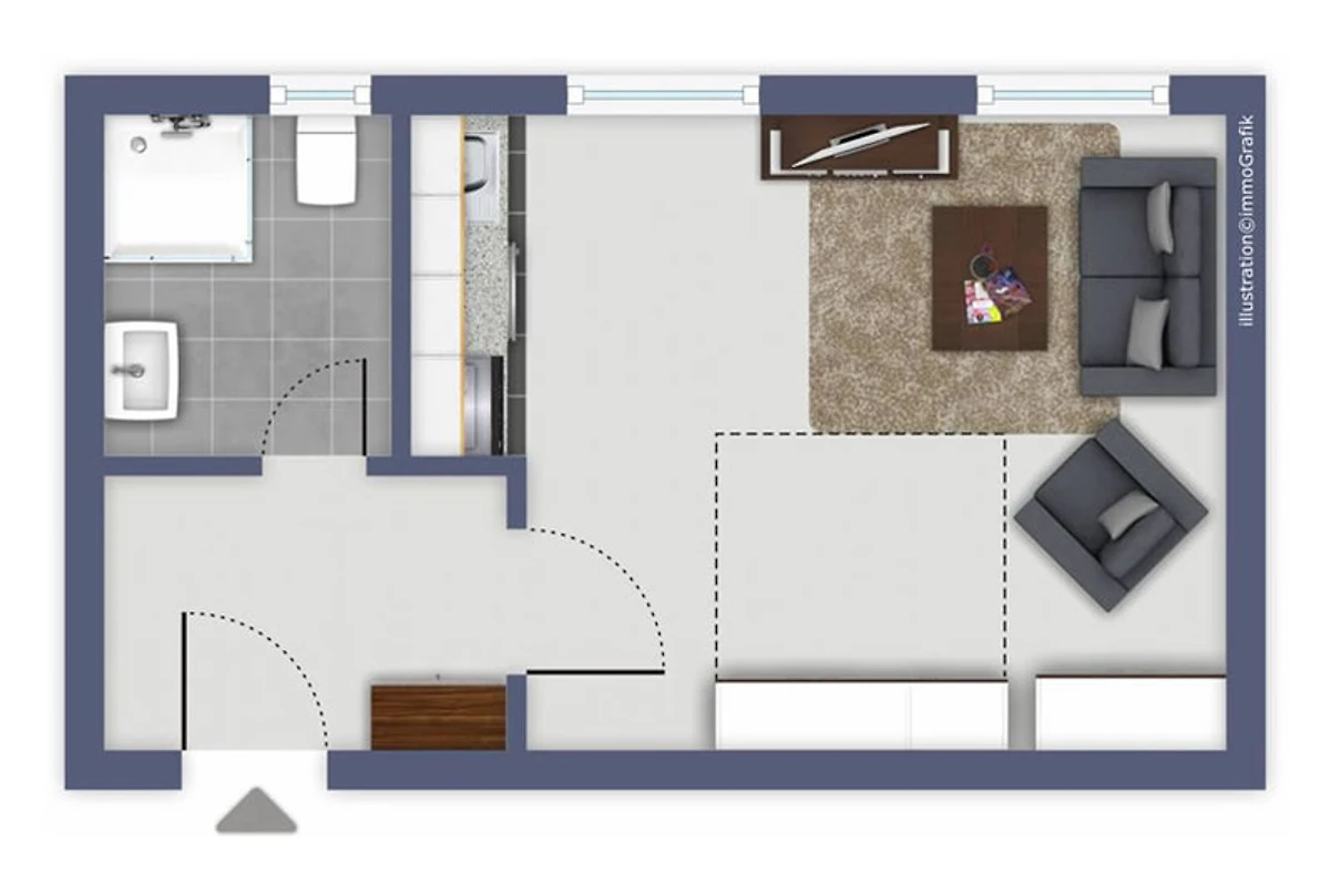 Die 1-Raum-Ferienwohnungen Nr. 8, bietet 2 Personen ausreichend Platz. Sie ist mit einem Wohnschlafraum mit Doppelschrankbett, Einbaukochzeile, Dusche/WC und Flur ausgestattet, und hat zum Teil seitlichen Seeblick. Sie befinden sich im 1. Stock.