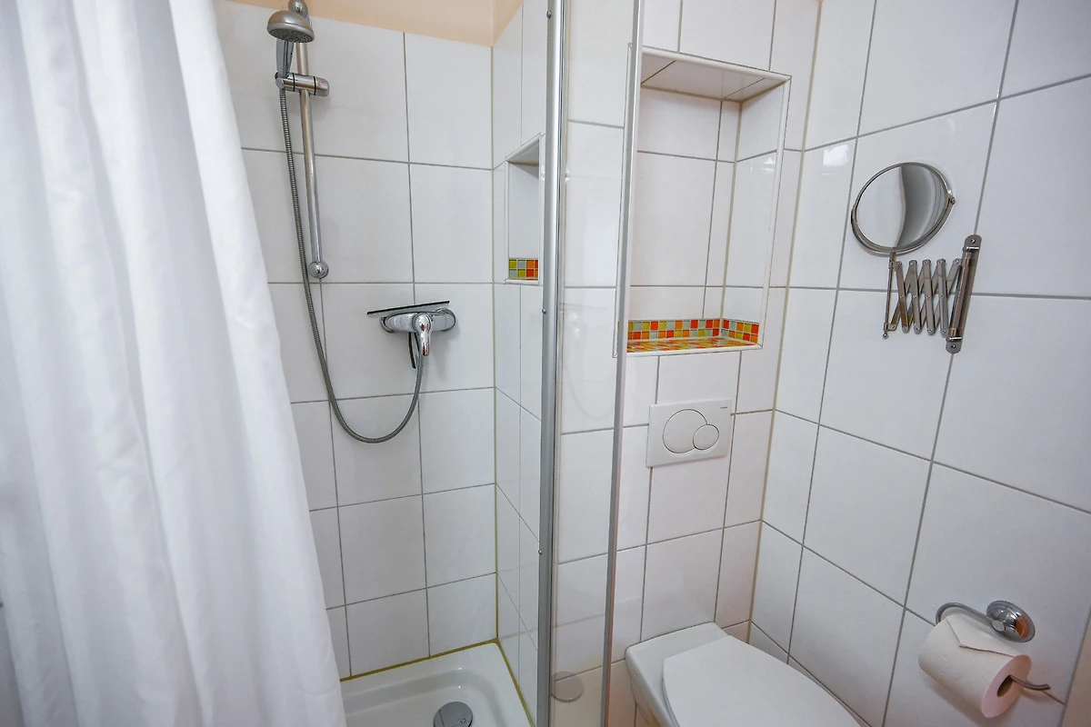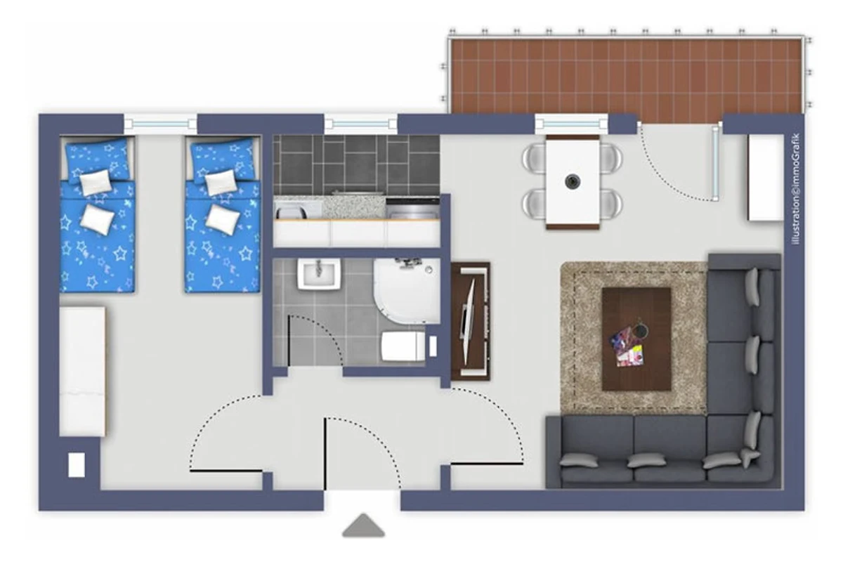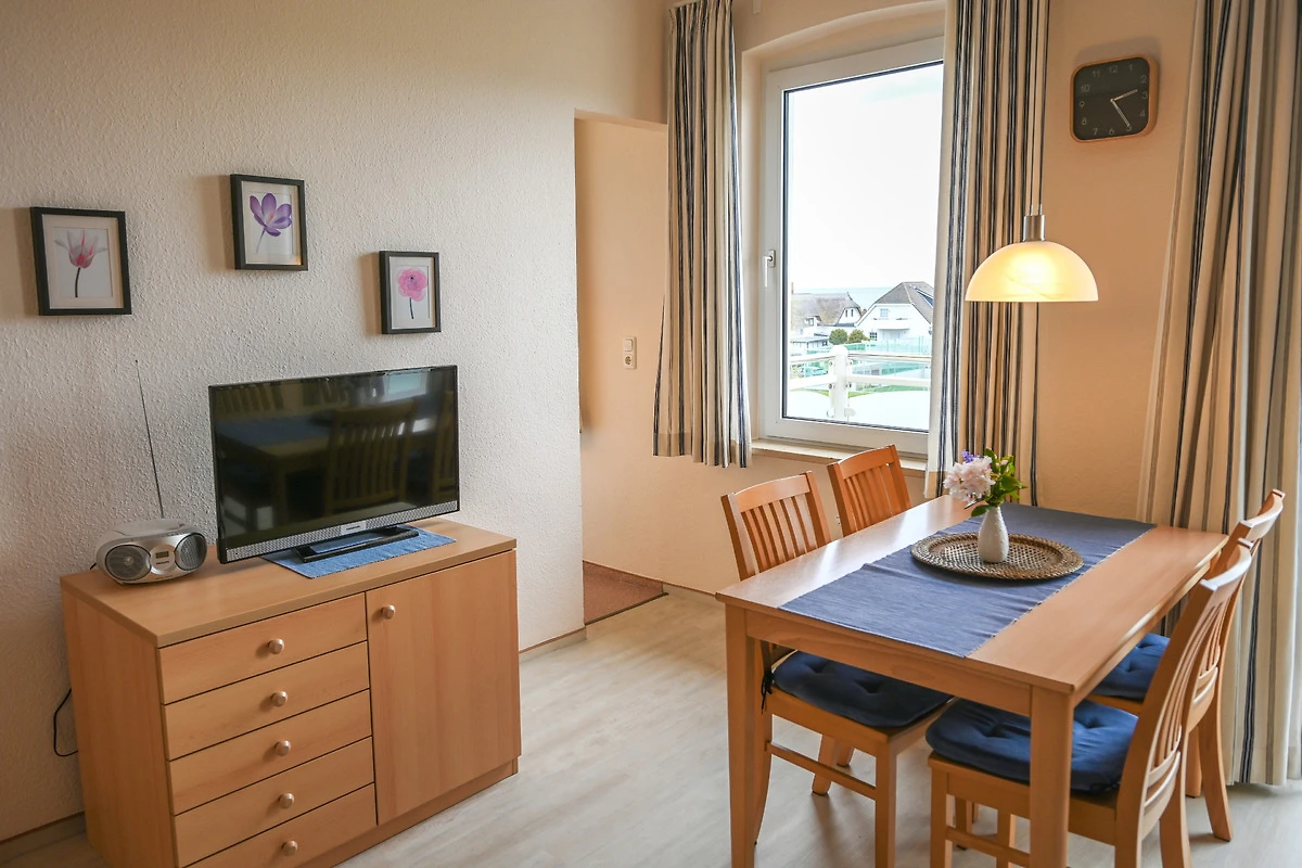 Unsere 2-Raum-Ferienwohnungen Nr.10 zeichnet sich durch ihren Seeblick aus. Sie liegt im 2. Stock und hat einen Wohnschlafraum, einen Schlafraum, Küche, einen Balkon, Dusche/WC und ist für 2-3 Personen ausgestattet.