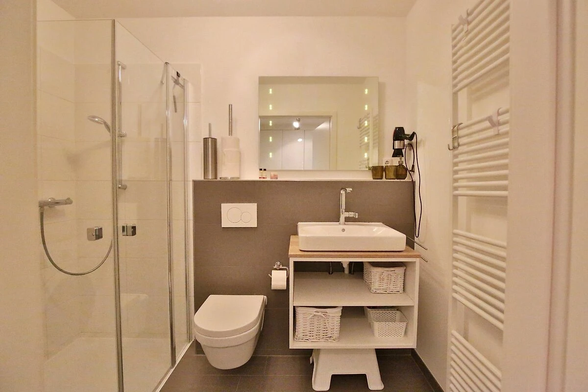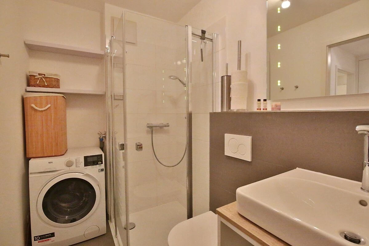 Das moderne Duschbad mit Handtuchheizung, Föhn und einer Waschmaschine mit integriertem Trockner komplettieren dieses schöne Appartement. Die Wohnung ist mit einer Fußbodenheizung ausgestattet.