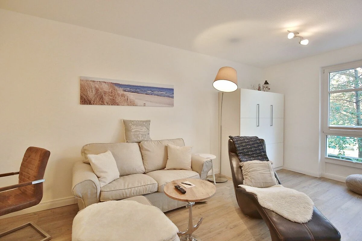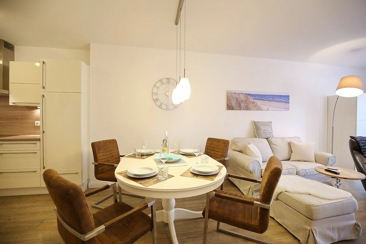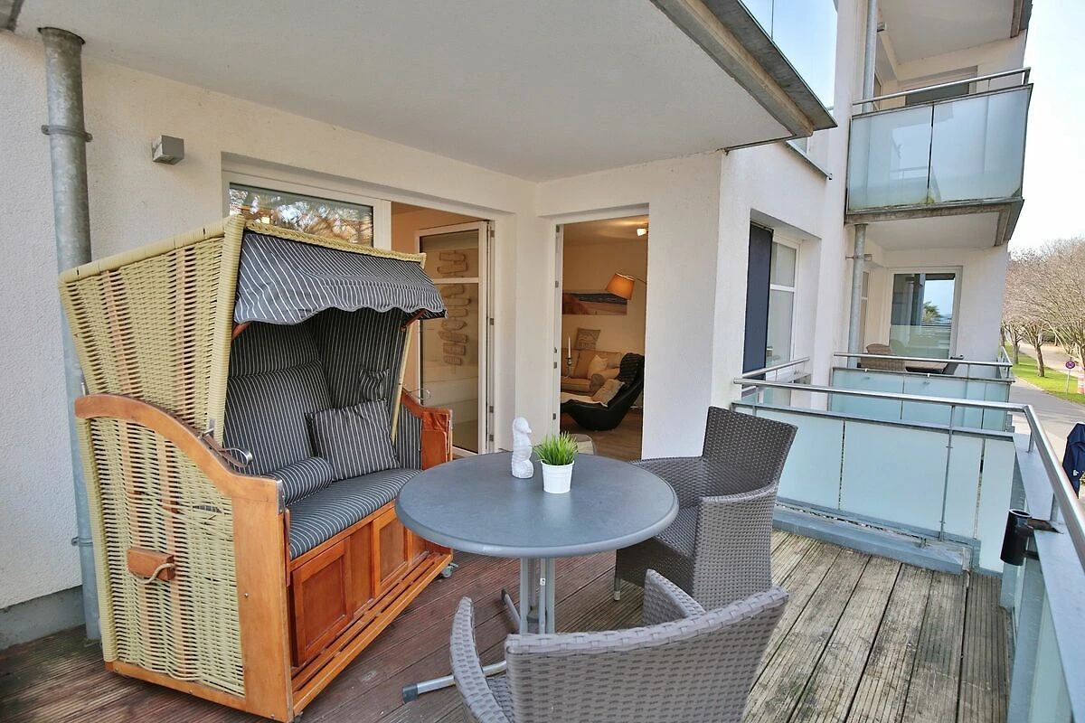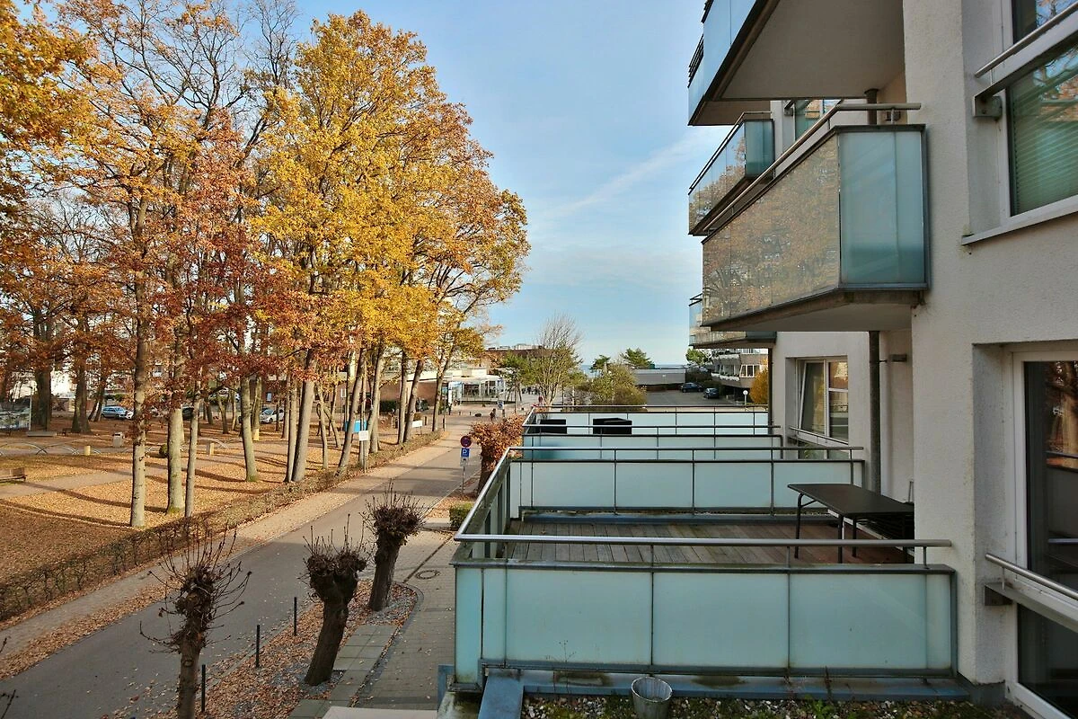 Der schöne Wohnraum mit Sitzecke, komfortablem Liegesessel, Flatscreen-TV verfügt auch über ein Schrankbett als dritten Schlafplatz (Liegefläche 1,40 x 2,0m). Der großzügige Essplatz mit 4 Stühlen lädt zum gemeinsamen Essen oder auch Spielen ein. Die Küchenzeile bietet eine Geschirrspülmaschine, ein Ceranfeld mit Backofen und Kühlschrank mit kleinem Gefrierfach. Vom Wohnzimmer und vom Schlafzimmer aus haben Sie Zugang zum Nord-Ost Balkon, von dem aus Sie einen seitlich eingeschränkten Seeblick sowie den schönen Blick in den Kurpark genießen können. Hier steht auch ein Strandkorb auf dem Balkon für Sie bereit.