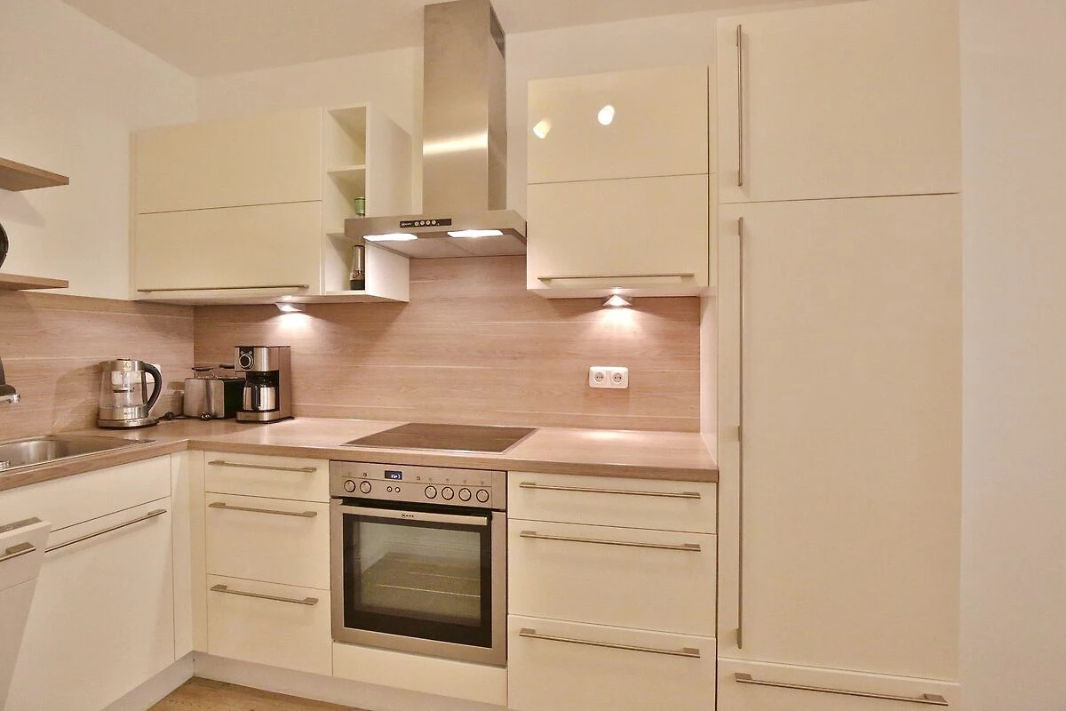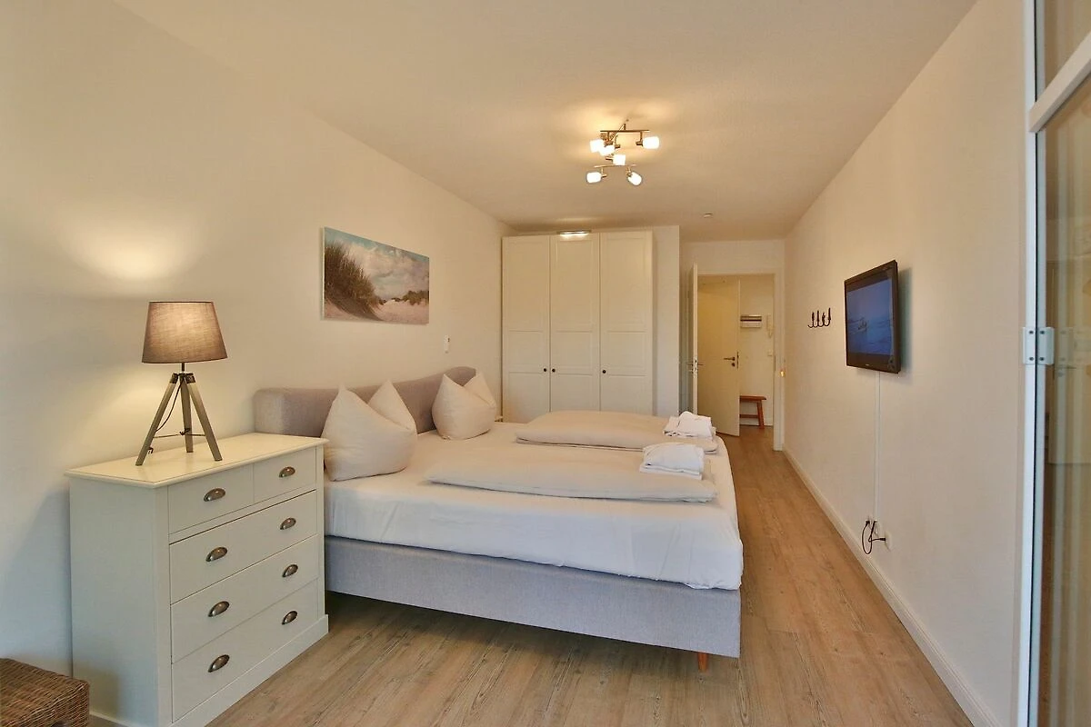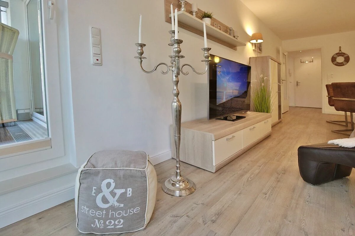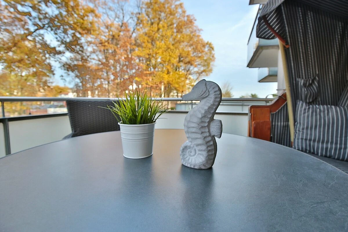 Der schöne Wohnraum mit Sitzecke, komfortablem Liegesessel, Flatscreen-TV verfügt auch über ein Schrankbett als dritten Schlafplatz (Liegefläche 1,40 x 2,0m). Der großzügige Essplatz mit 4 Stühlen lädt zum gemeinsamen Essen oder auch Spielen ein. Die Küchenzeile bietet eine Geschirrspülmaschine, ein Ceranfeld mit Backofen und Kühlschrank mit kleinem Gefrierfach. Vom Wohnzimmer und vom Schlafzimmer aus haben Sie Zugang zum Nord-Ost Balkon, von dem aus Sie einen seitlich eingeschränkten Seeblick sowie den schönen Blick in den Kurpark genießen können. Hier steht auch ein Strandkorb auf dem Balkon für Sie bereit.
