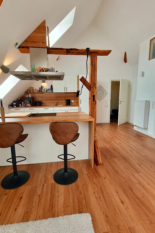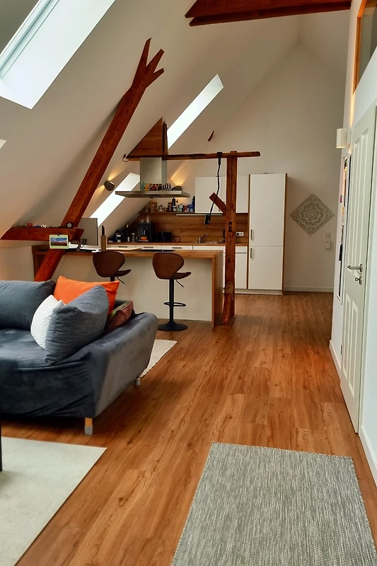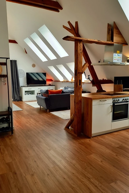 Willkommen in der großzügigen Ferienwohnung „besonderes Wohnen auf Zeit“ in einem Loft in Rätzlingen! Auf 70 m² erwartet Sie ein einladendes Zuhause für zwei Gäste, das mit durchdachtem Komfort überzeugt. Der offene Wohnbereich besticht durch hochwertige Fußböden und helle Räume, die ein behagliches Ambiente schaffen. Die voll ausgestattete Küchenzeile bietet alles, was Sie für entspannte Kochabende benötigen: ein 4-Platten-Cerankochfeld, Backofen, Dunstabzugshaube, Geschirrspüler, Kühlschrank, Wasserkocher, Kaffeemaschine, Toaster und Geschirr stehen bereit. Im Schlafzimmer genießen Sie erholsame Nächte mit frischer Bettwäsche, während das moderne Bad mit Handtüchern ausgestattet ist.