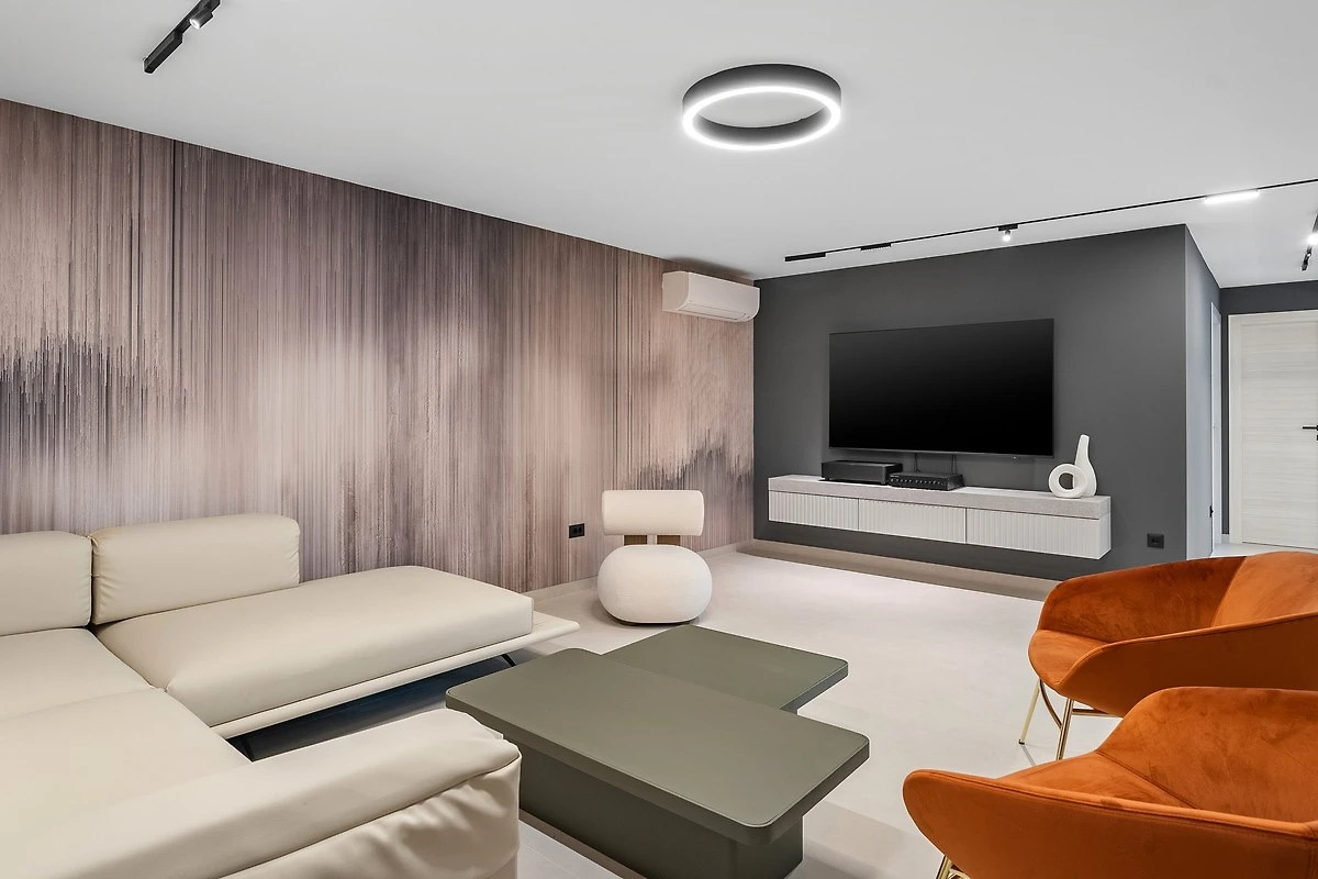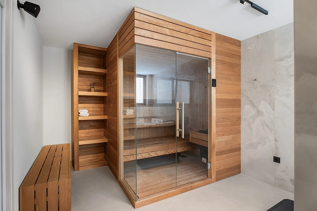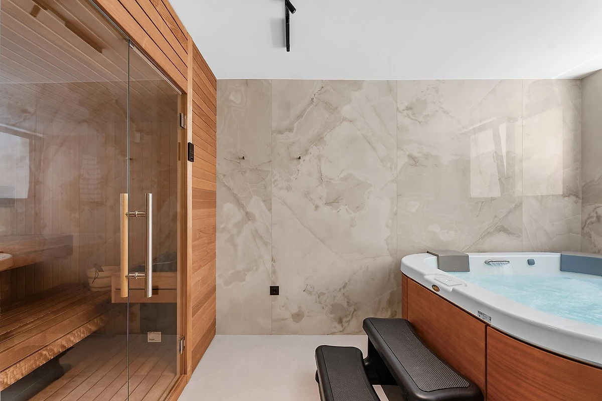 * Eine 150 Quadratmeter große SPASS- und SPA-ZONE befindet sich im Untergeschoss und ist vom Wohnbereich aus zugänglich. Sie verfügt über eine finnische Sauna, einen Whirlpool, einen Billardtisch, Sofas, Flachbildfernseher, kostenloses WLAN, Klimaanlage, eine Küchenzeile mit Kochinsel und Eismaschine, eine ebenerdige Dusche und eine separate Toilette.