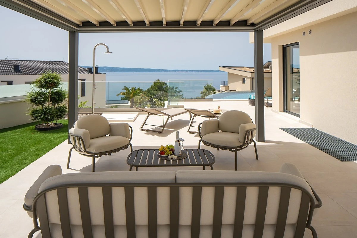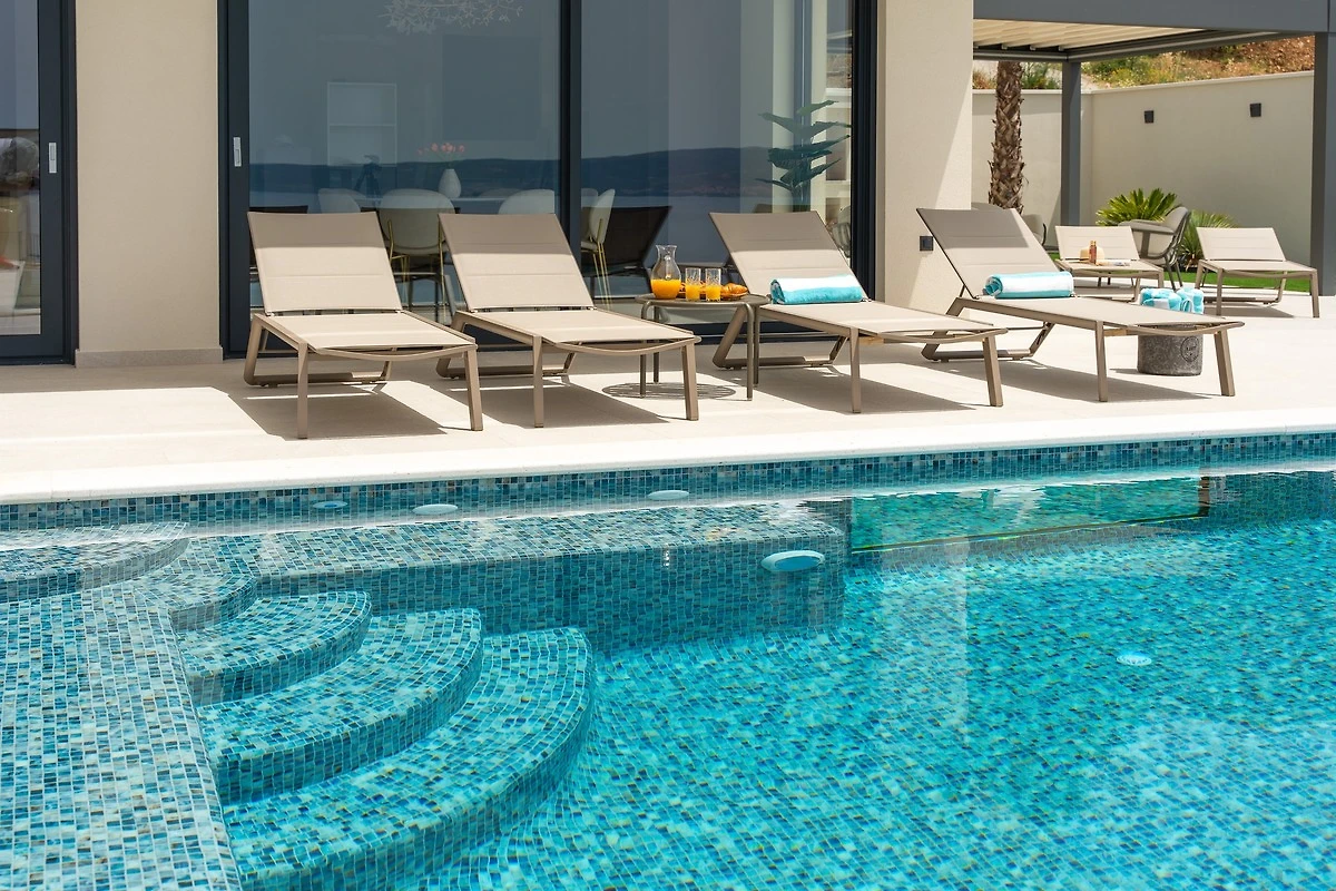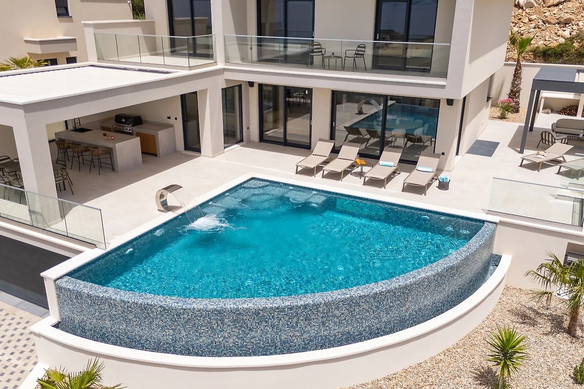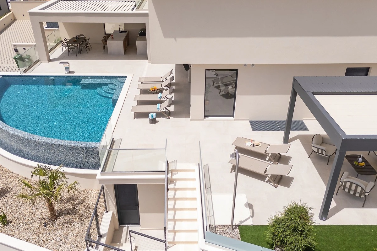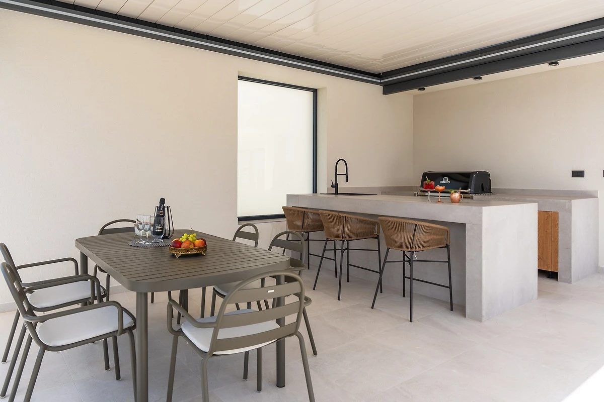 * Der Außenbereich im erhöhten Erdgeschoss verfügt über einen privaten, beheizten 40,5 Quadratmeter (9 x 4,5 Meter) großen Infinity-Pool mit Hydromassage und einem vollautomatischen Salzelektrolysesystem. Außerdem gibt es sechs Liegestühle, eine Außendusche, einen überdachten Essbereich, in dem bequem acht Personen Platz finden, eine Küchenzeile mit Gasgrill, einen Loungebereich und einen offenen Blick auf das Meer. Sie haben Zugang zur Sonnenterrasse und einer traditionellen Grillecke für Ihre Grillkünste hinter der schicken und gemütlichen Loungeecke.