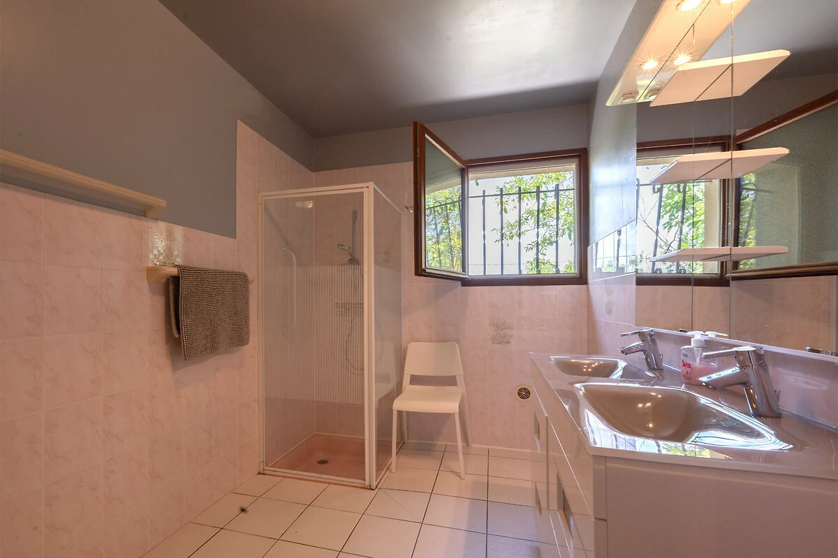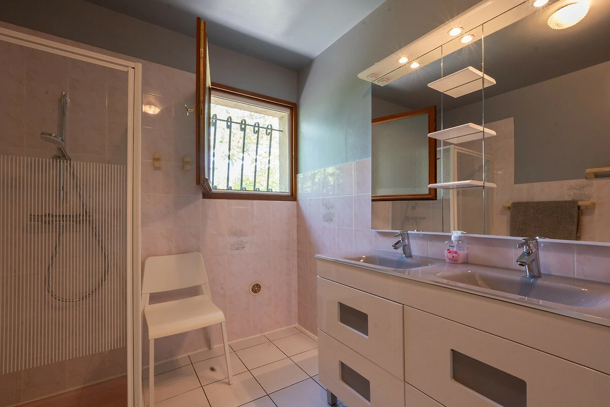 . 1 badkamer met dubbele wastafel, douche en toilet