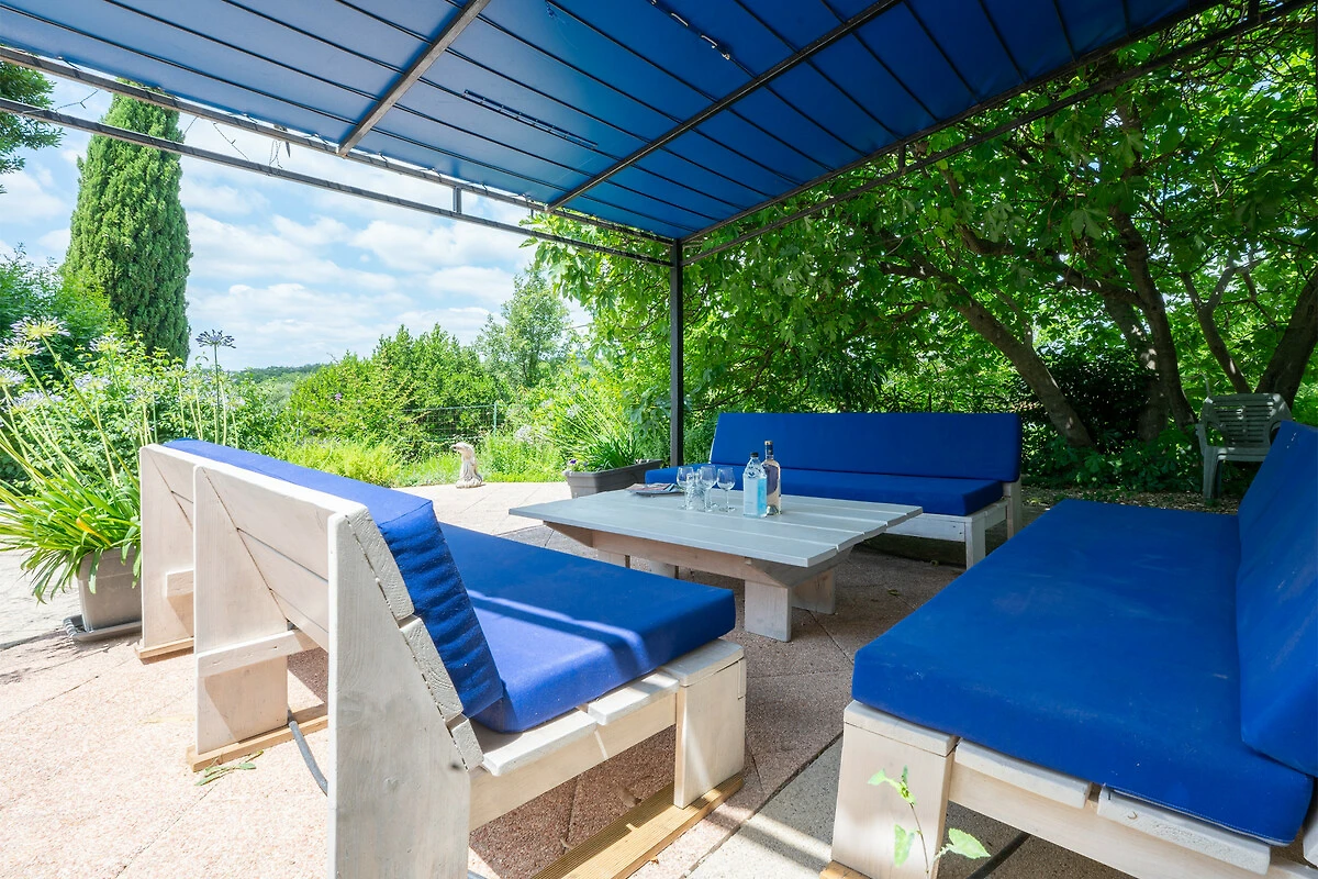 Überdachte Terrasse am Swimmingpool – perfekt für deinen Morgenkaffee oder ein gutes Buch