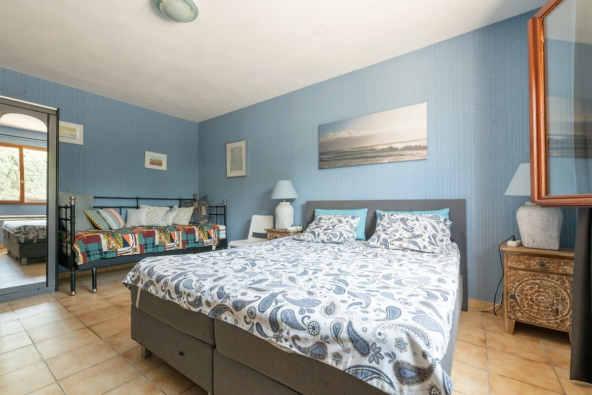 . Schlafzimmer 1: Queensize-Bett (160 x 210 cm) + zwei Einzelbetten (90 x 200 cm)