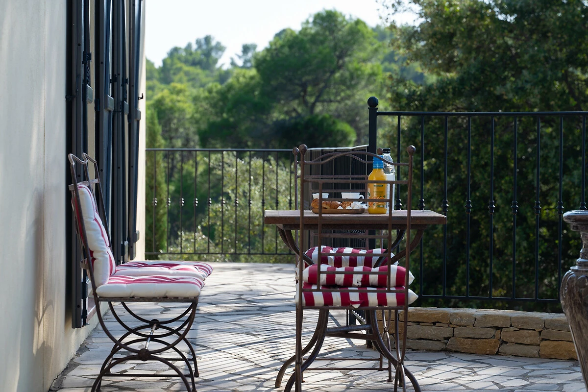 . Sonnige Terrasse mit Liegen und Sonnenschirmen, Blick auf Wälder und die Bergkette Sainte-Victoire