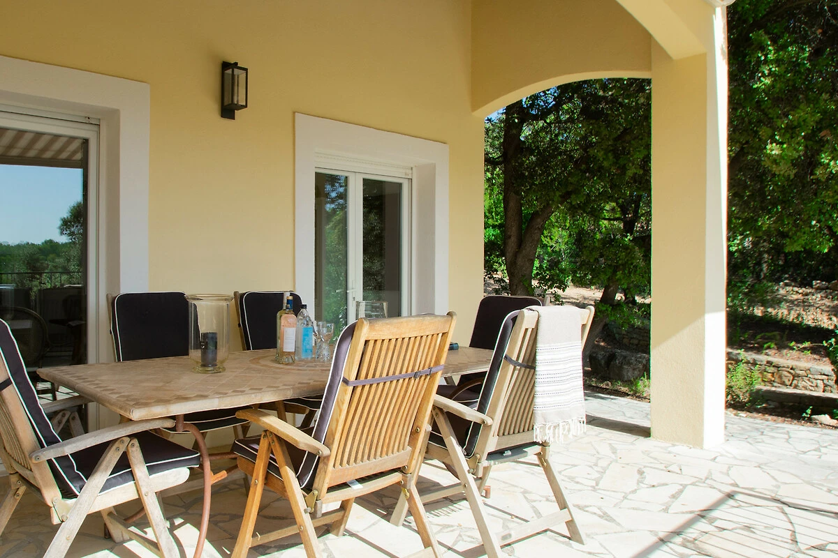 . Grosse überdachte Terrasse an der Ostseite mit Esstisch – ideal für lange Dinners im Freien