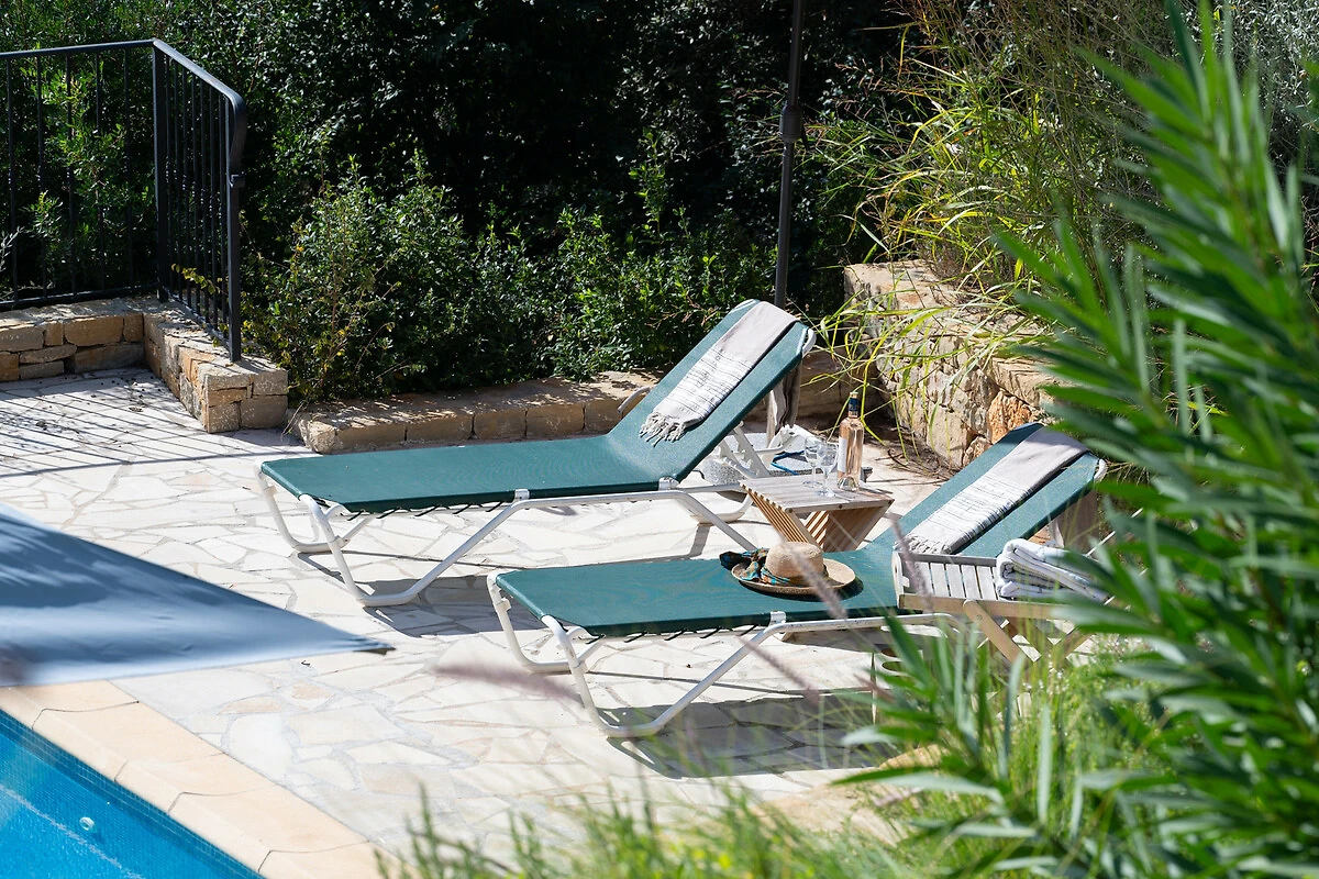. Beheiztes privates Schwimmbad (8 × 4 m) mit Aussendusche, umgeben von Oleander