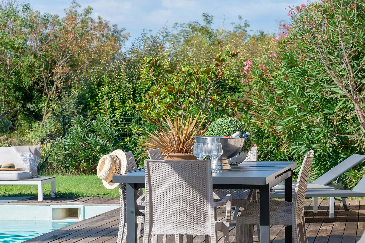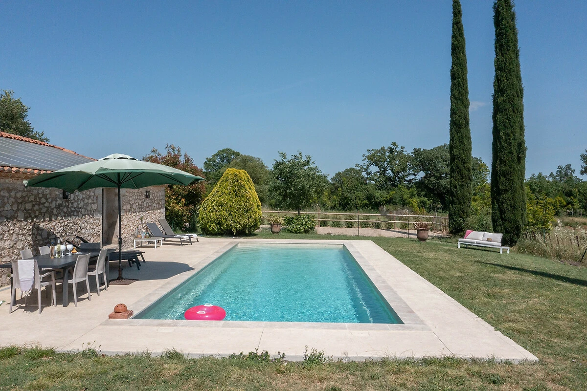 . Eingezäuntes privates Schwimmbad mit Sonnenterrasse, Loungebereich, Esstisch und grossem Rasenplatz