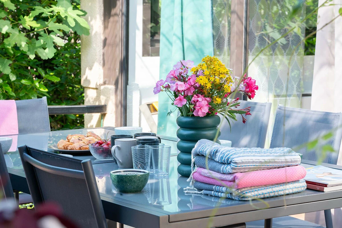 . Zwei zusätzliche Terrassen: eine an der Küche (ideal für Frühstück in der Sonne) und eine unter dem Vordach am Eingang