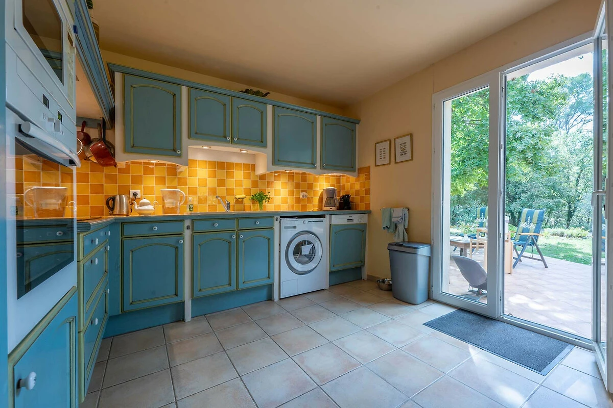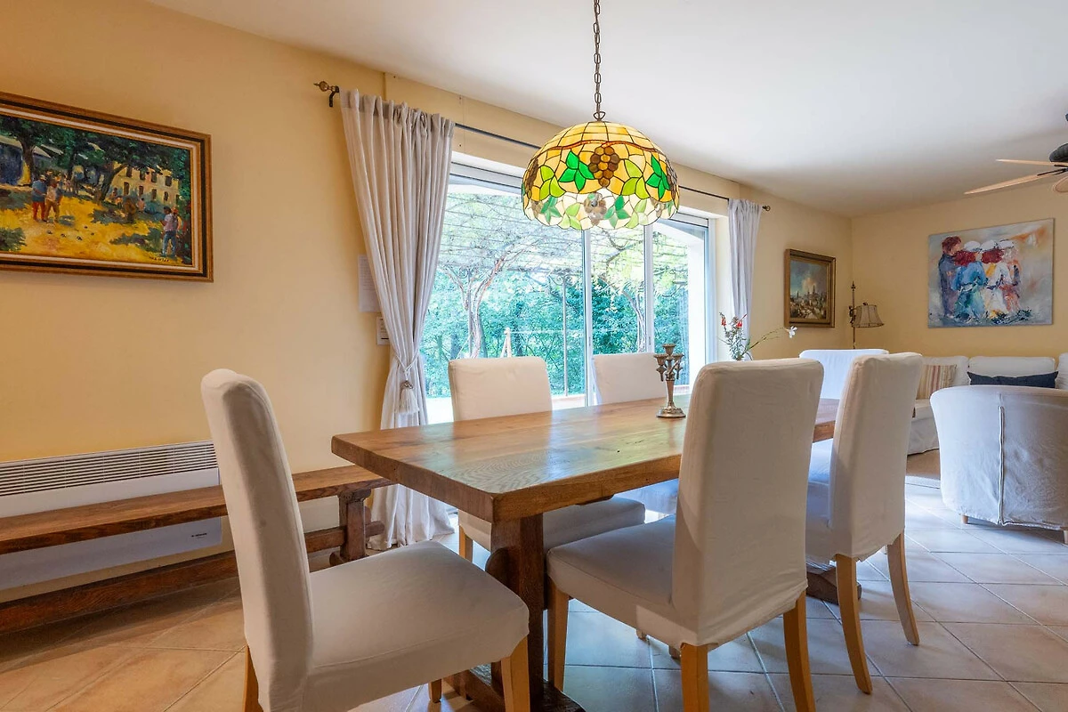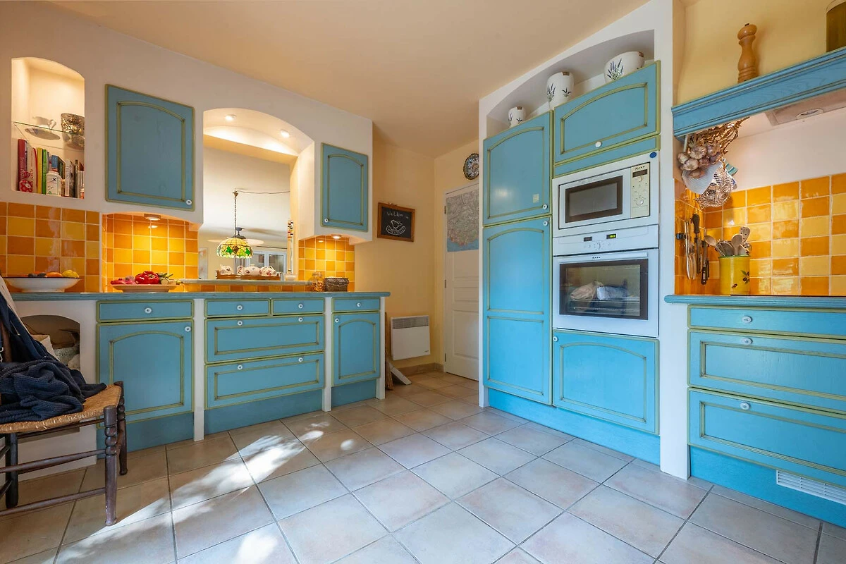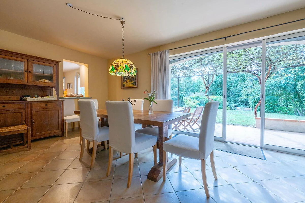 Im Inneren wartet ein geräumiges Wohnzimmer mit einer gemütlichen Eckcouch, grossem Esstisch für 8 Personen, TV mit HDMI und Chromecast und blitzschnellem Glasfaser-WLAN, das sogar bis zum Swimmingpool reicht. Die angrenzende offene Küche ist vollständig ausgestattet mit modernen Annehmlichkeiten wie Induktionsherd, Nespresso-Gerät, Geschirrspüler und Waschmaschine.