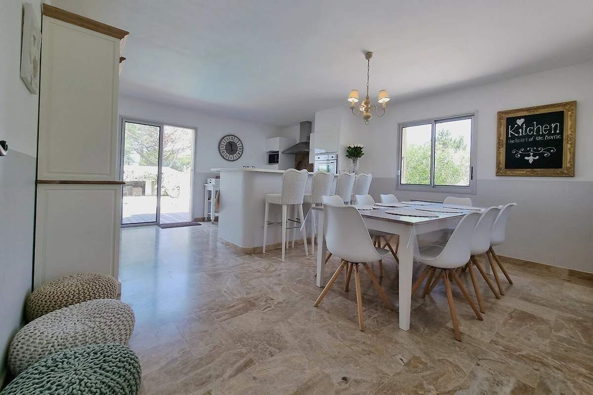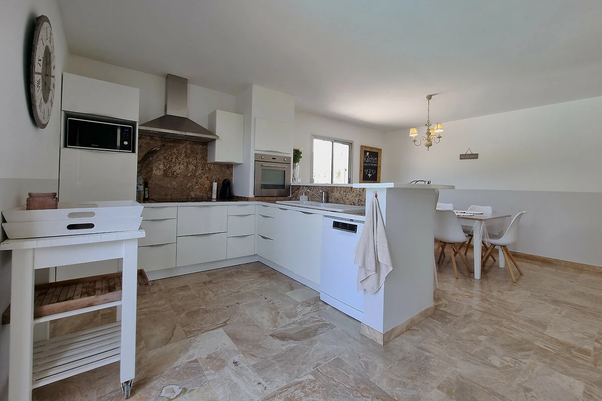 Die vollständig ausgestattete Küche ist modern und bietet direkten Zugang zu einer Terrasse mit Esstisch, ideal für gemütliche Mahlzeiten.