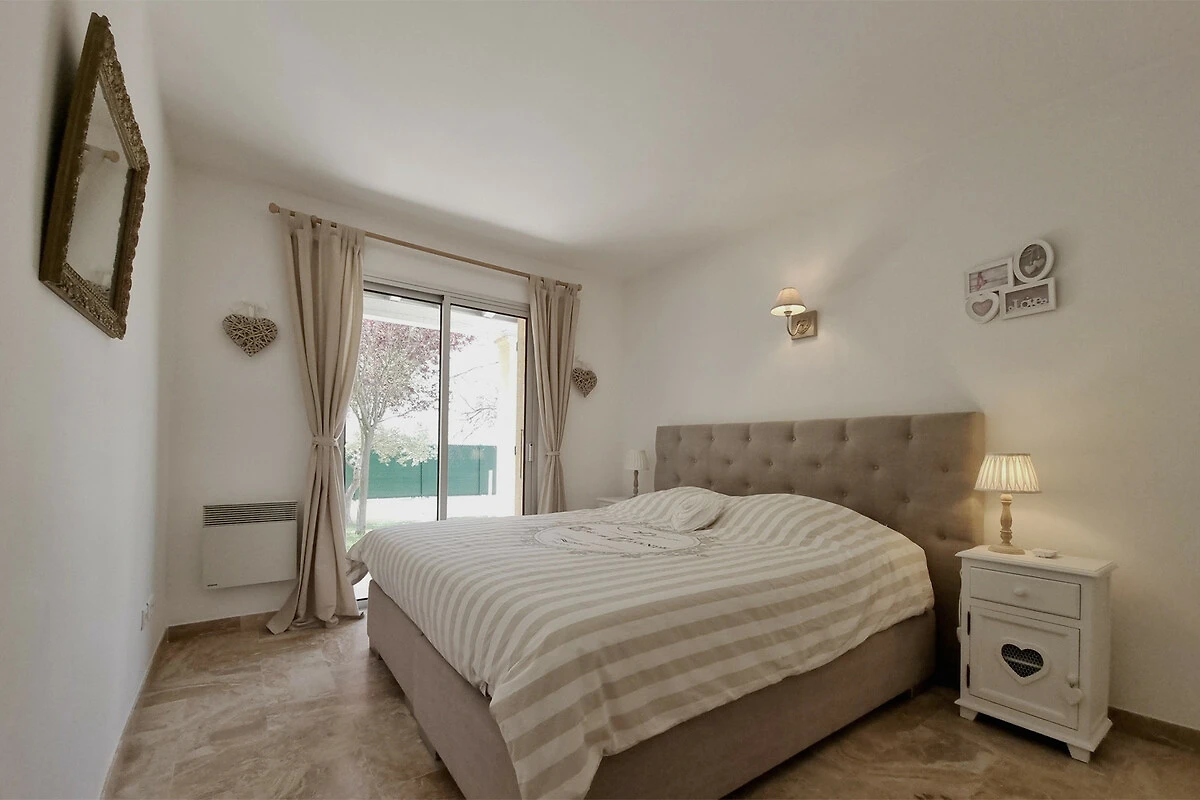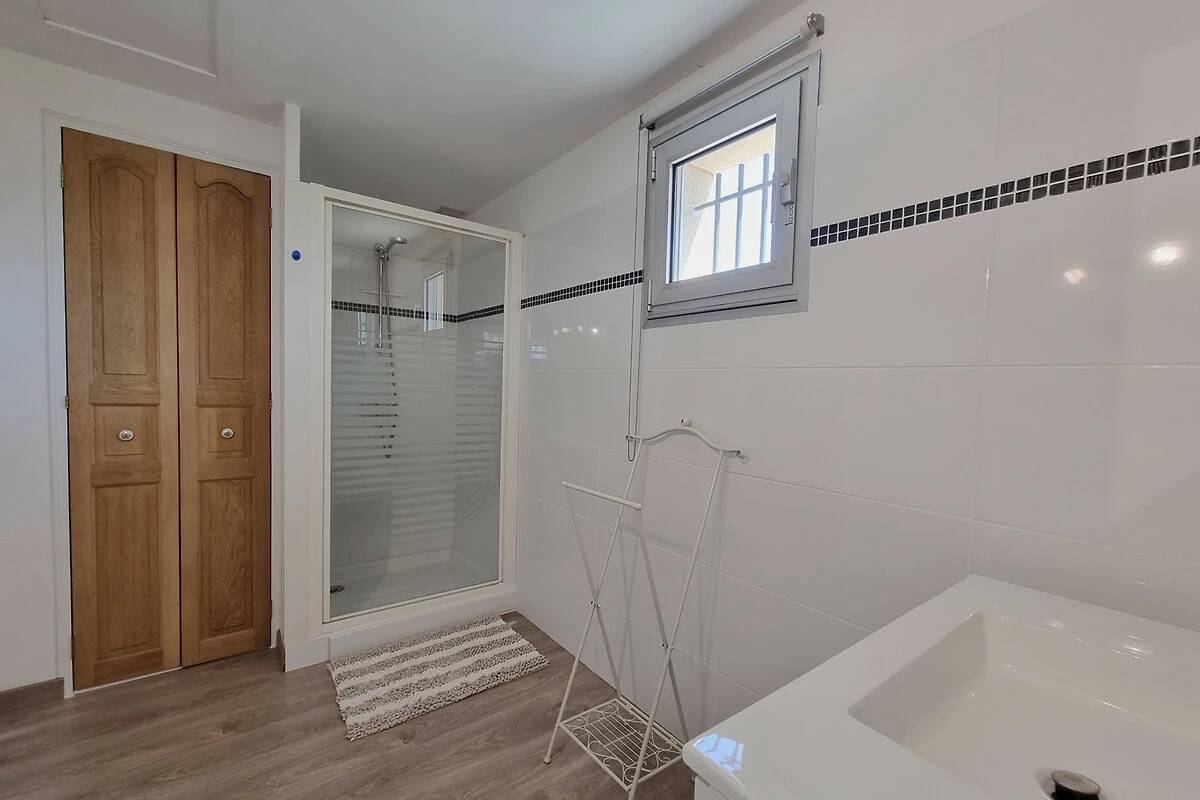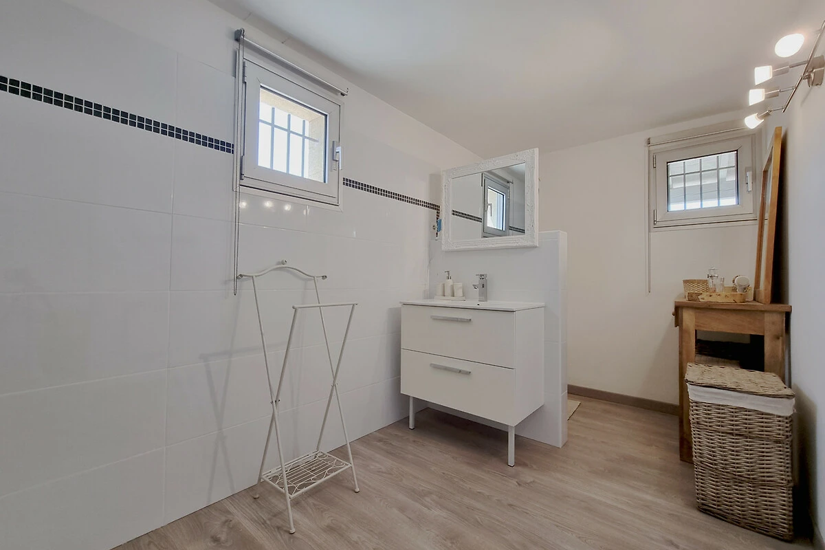 Erdgeschoss: Zwei komfortable Schlafzimmer, jeweils mit einem Bett von 180x200 cm, und ein modernes Badezimmer mit Walk-in-Dusche und Waschbecken.