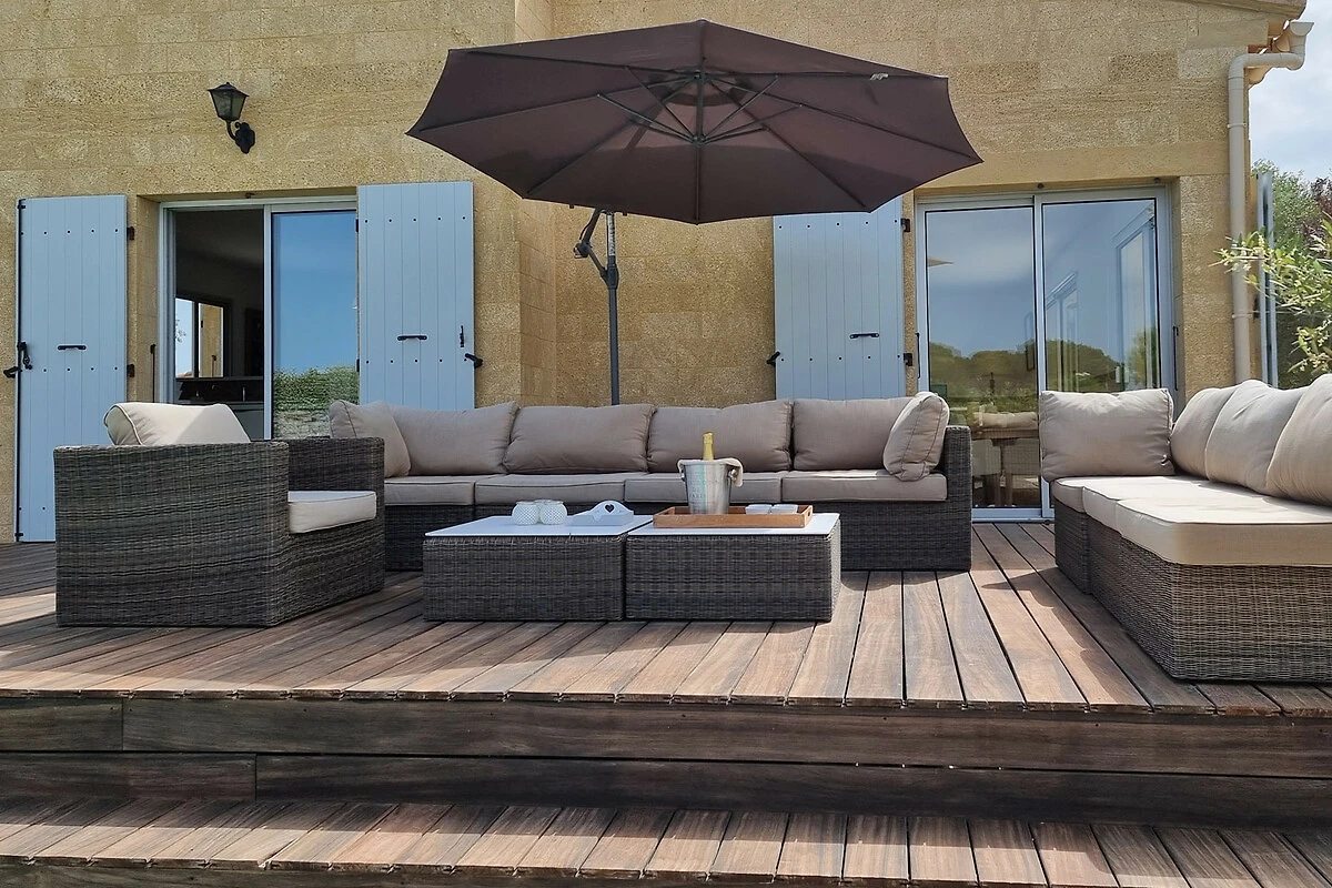 Lounge-Terrasse angrenzend an die Küche, ideal zum Entspannen mit einem guten Buch oder einem Aperitif.