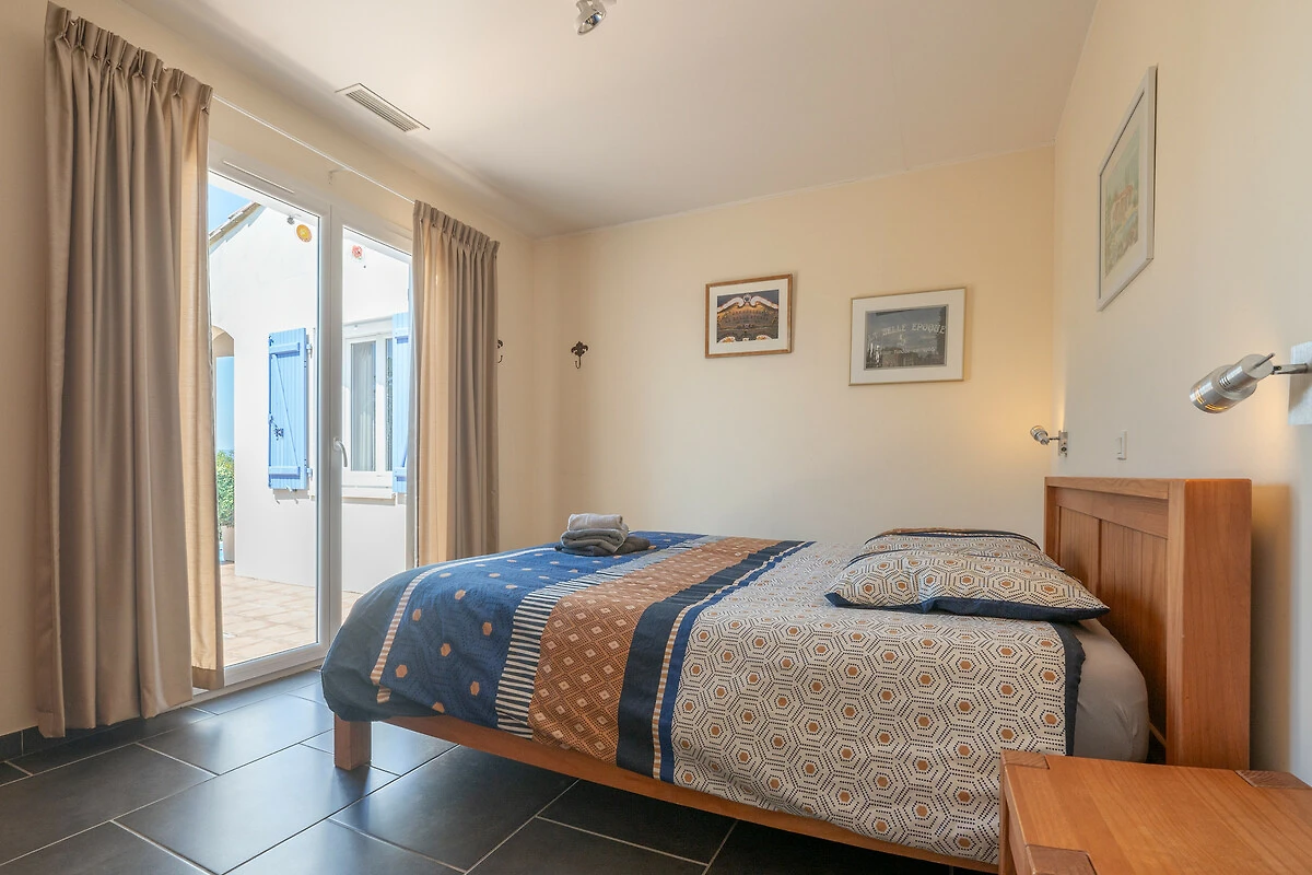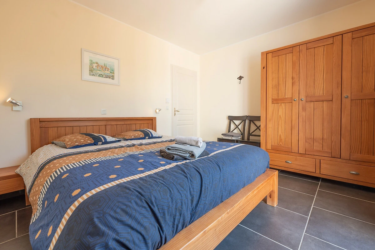 • Schlafzimmer 1: 160/200 cm | Vorhänge | Fensterläden | Kleiderschrank | Terrassentüren