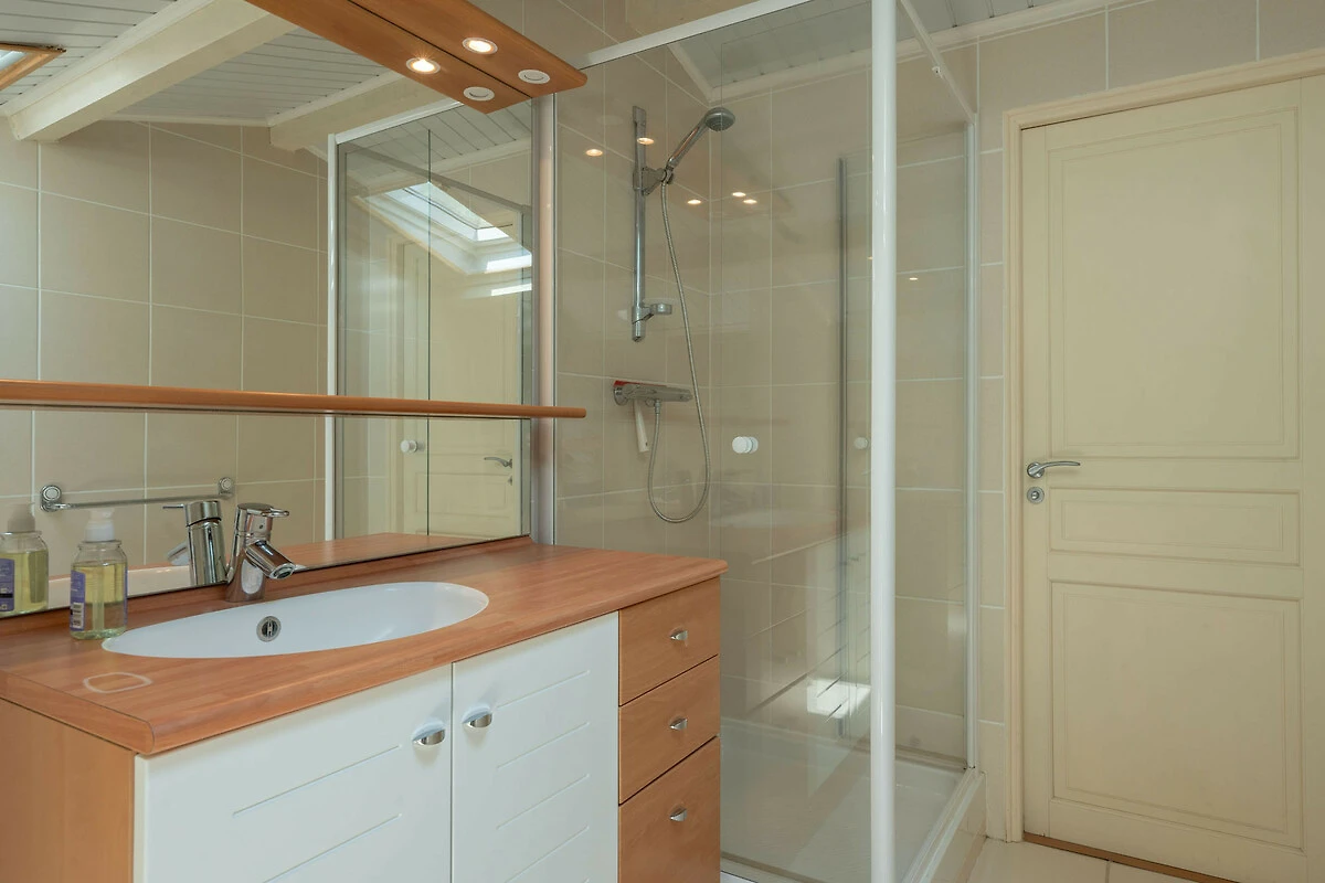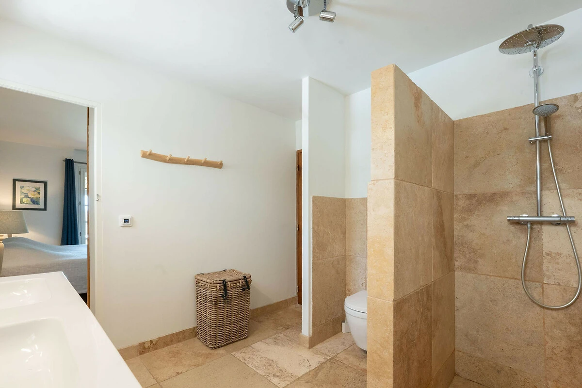 Badezimmer 1: Begehbare Dusche, Doppelwaschbecken und Toilette