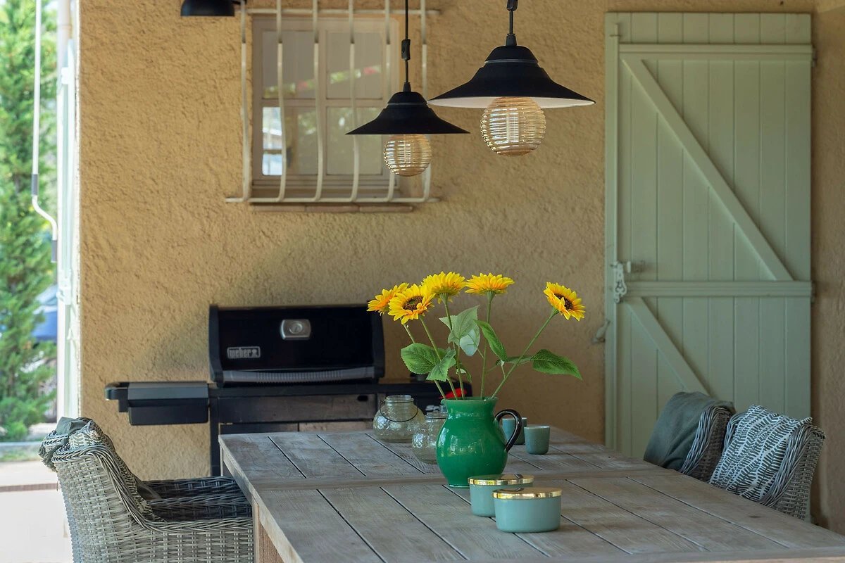 Geniessen Sie das ultimative Landleben auf der grossen überdachten Terrasse mit Esstisch, Lounge-Set und Gasgrill – der perfekte Ort für lange Mittagessen im Schatten oder einen Aperitif mit Ausblick.