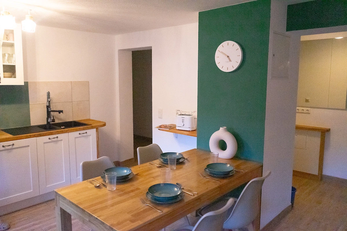 Geniessen Sie Ihren Urlaub in vollen Zügen, bei schönem Wetter auch draussen auf der Terrasse. Die gut ausgestattete Küche besitzt unter anderem einen Kühlschrank, einen Herd zum Kochen und sogar eine Spülmaschine.