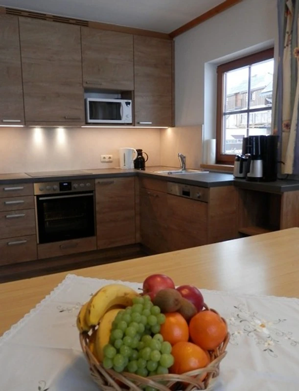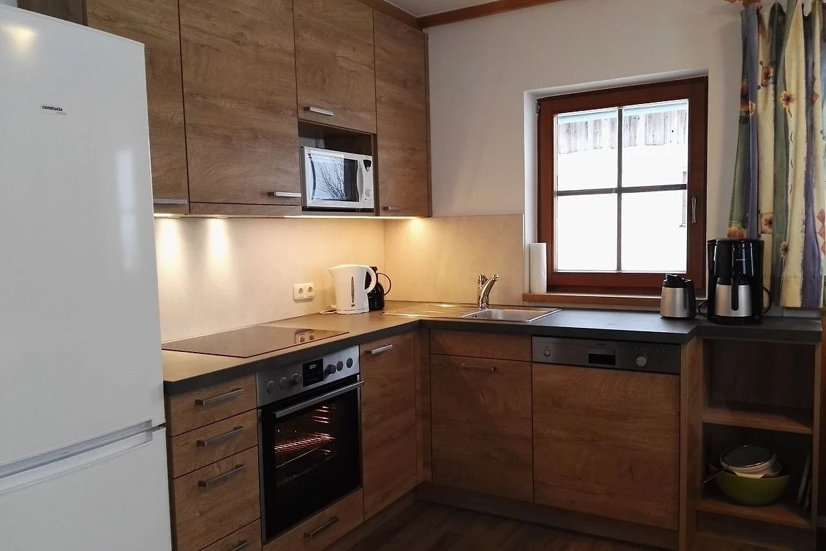 Die voll ausgestattete Küche bietet alles, was man für einen komfortablen Selbstversorger-Urlaub braucht: Herd, Backofen, Kühlschrank mit Gefrierfach, Kaffeemaschine, Mikrowelle und ausreichend Koch- und Essgeschirr.
