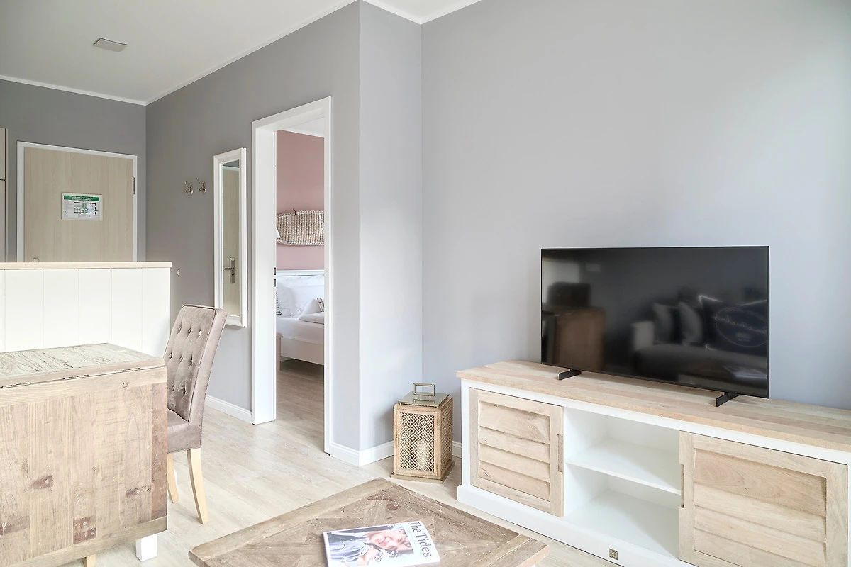 So könnt ihr sowohl aus dem gemütlichen Schlafzimmer als auch aus dem komfortablen Wohnbereich die Nase in den Nordseewind halten. Apropos Wohnzimmer: Da die Couch in einen Schlafplatz umgewandelt werden kann, könnt ihr das Apartment mit bis zu vier Personen bewohnen. Gekocht wird in der apartmenteigenen Küche.