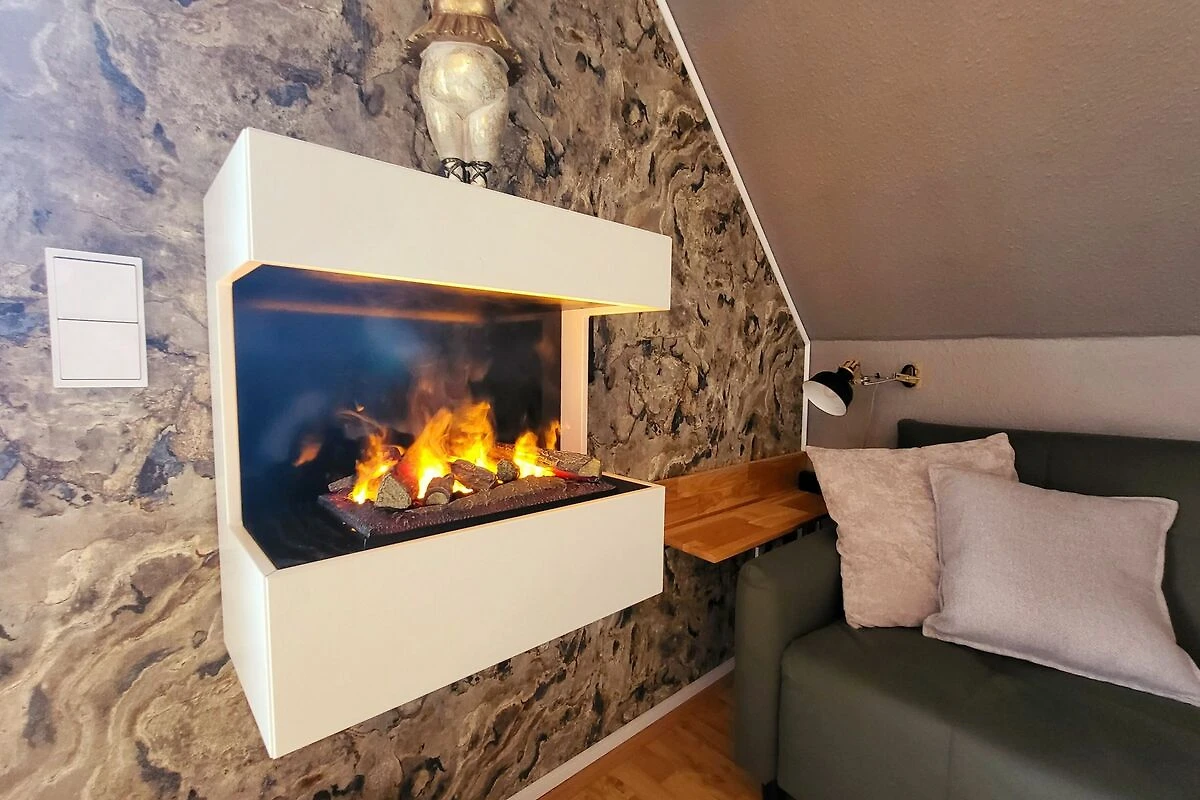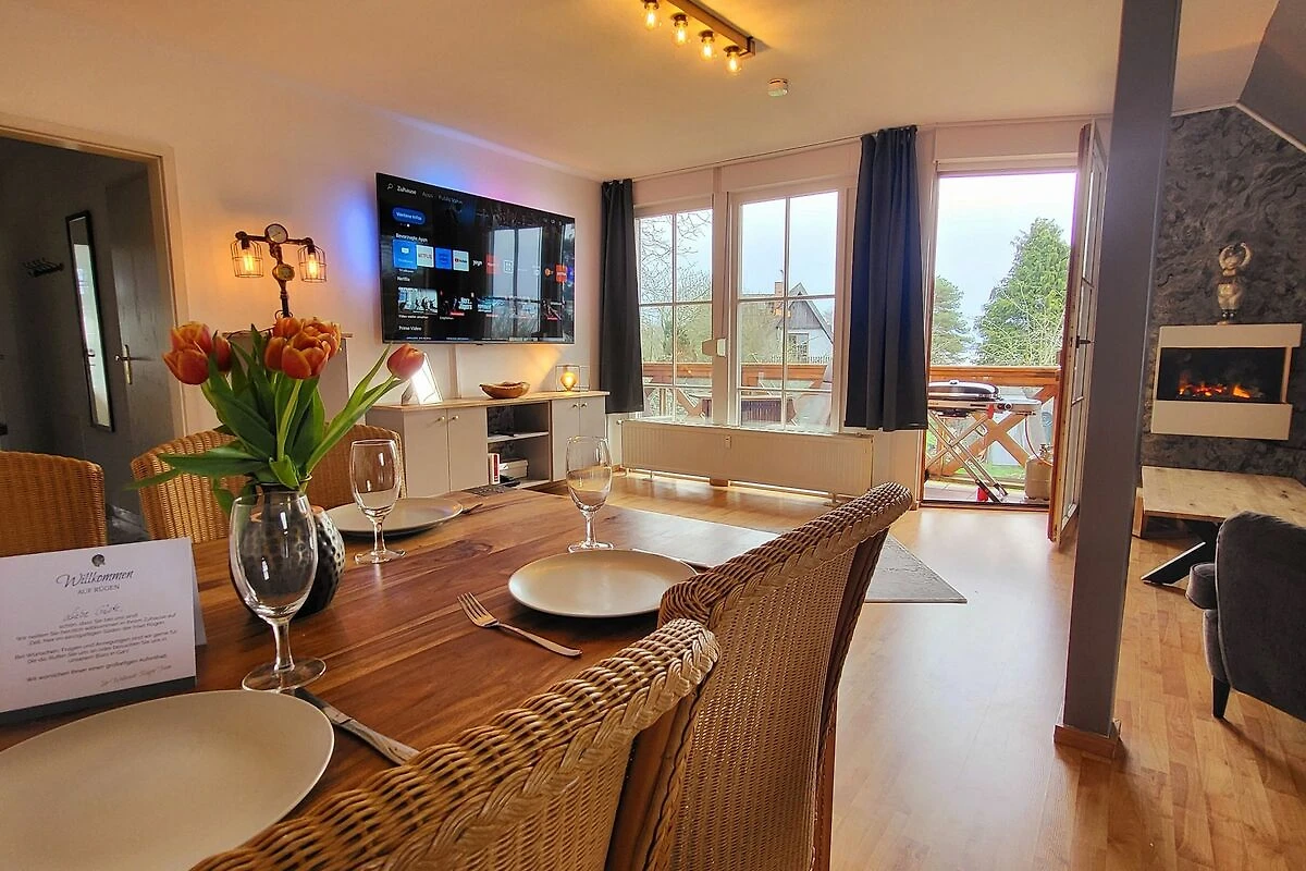 WOHNEN // Wohnraum mit Essbereich, Sitzgarnitur mit bequemer Couch (mit Schlaffunktion), Sessel, Elektrokamin, SMART-TV, Balkon mit Meerblick ++