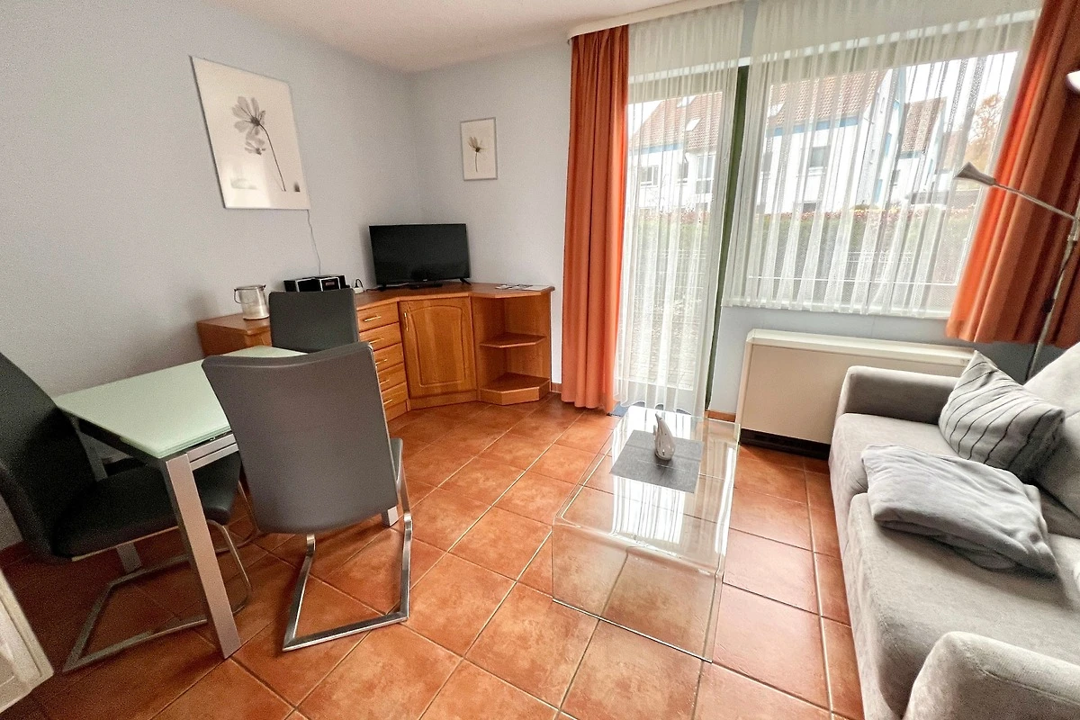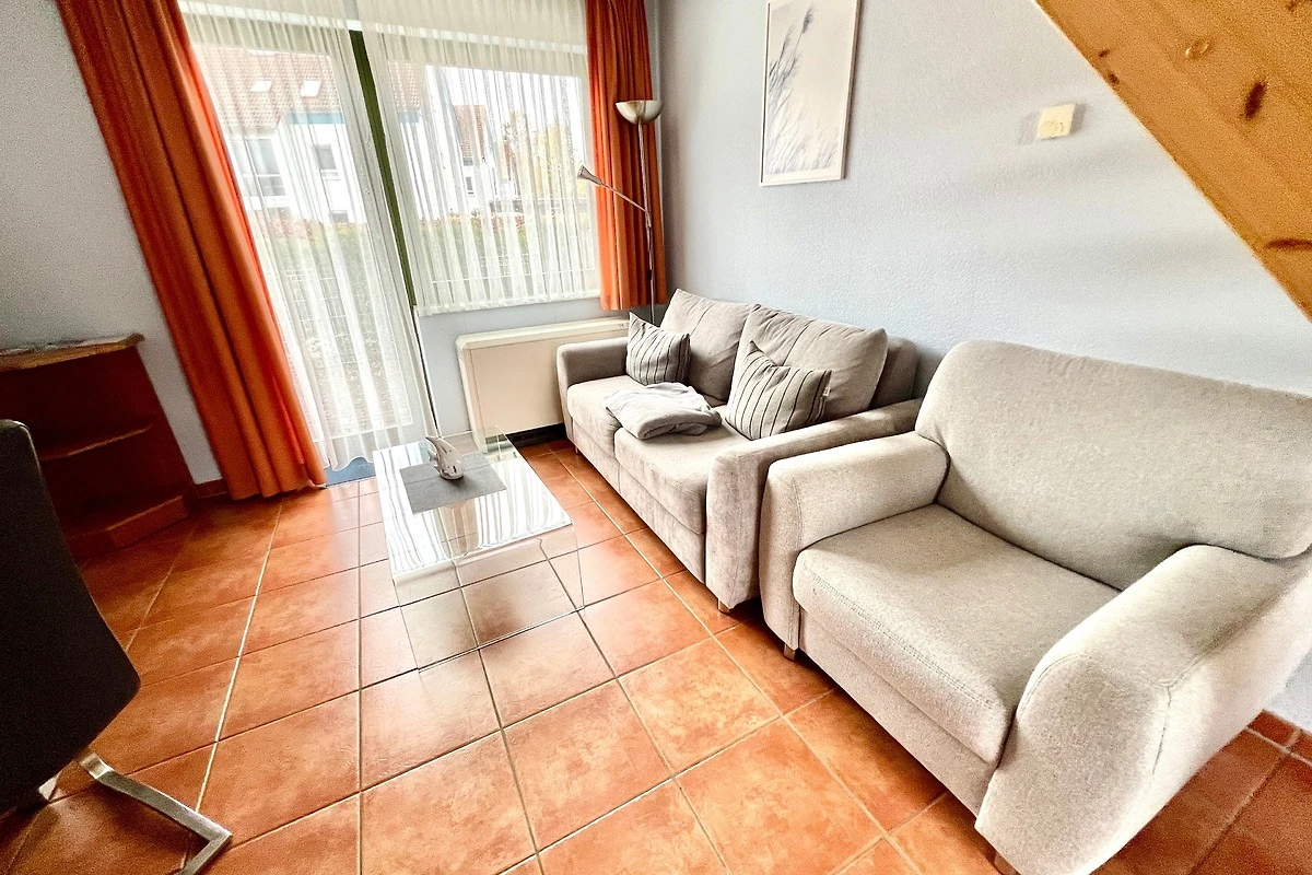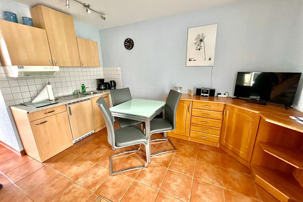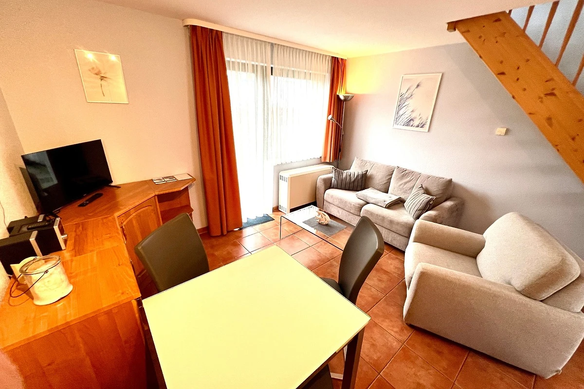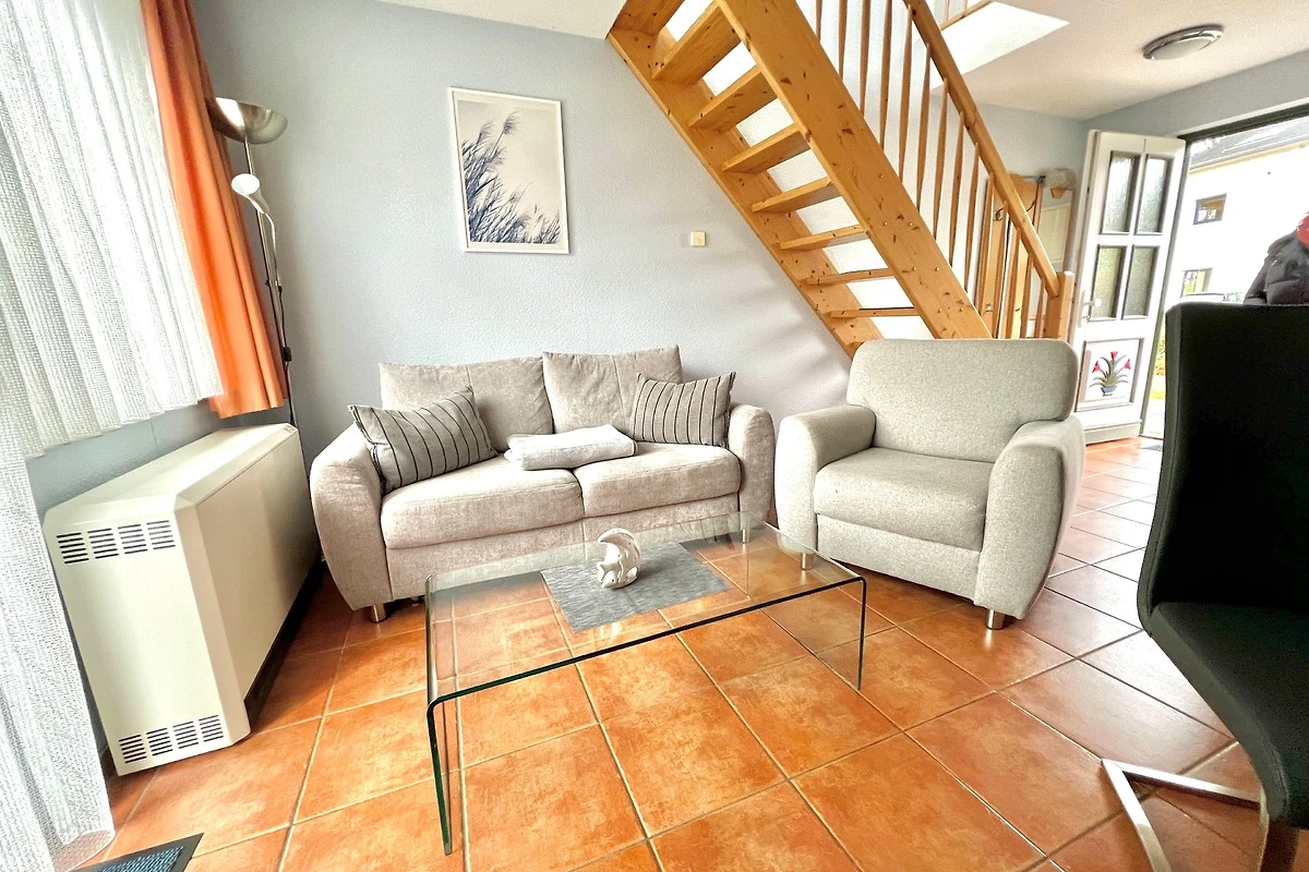 Gemütliche Ferienwohnung auf 42qm. Unten Wohnbereich mit Sofa,Sessel, FlachTV, Radio und kleiner Küchenzeile mit sehr guter Ausstattung. Angeschlossener Terrasse mit Gartenmöbeln zum sonnen oder einfach nur entspannen.
