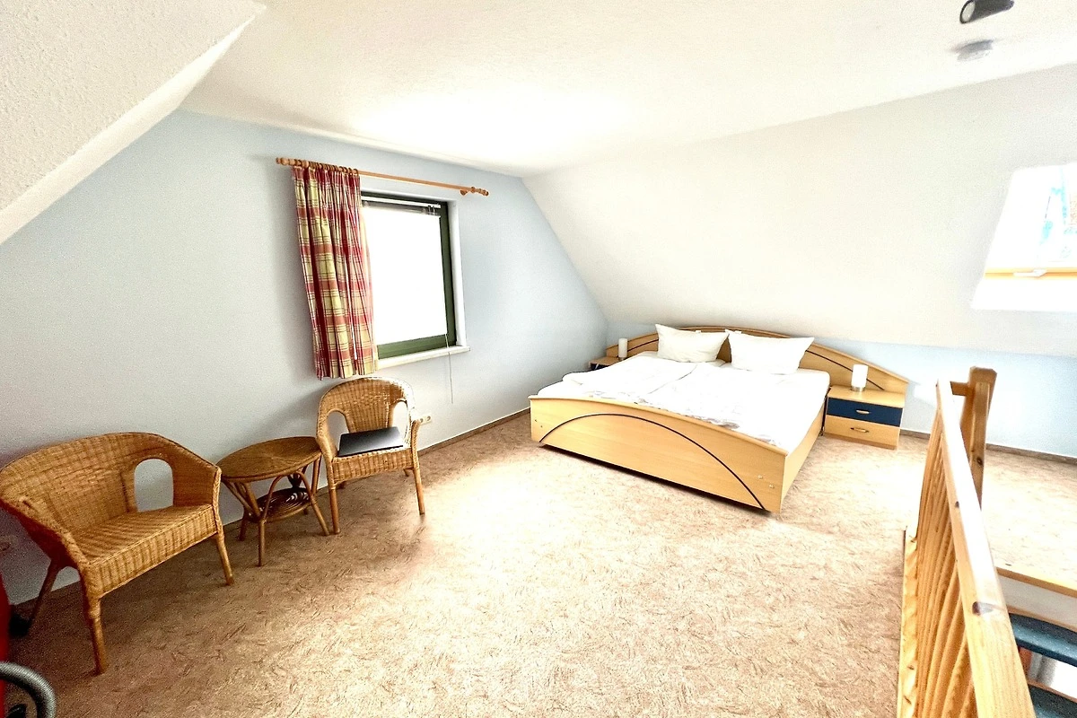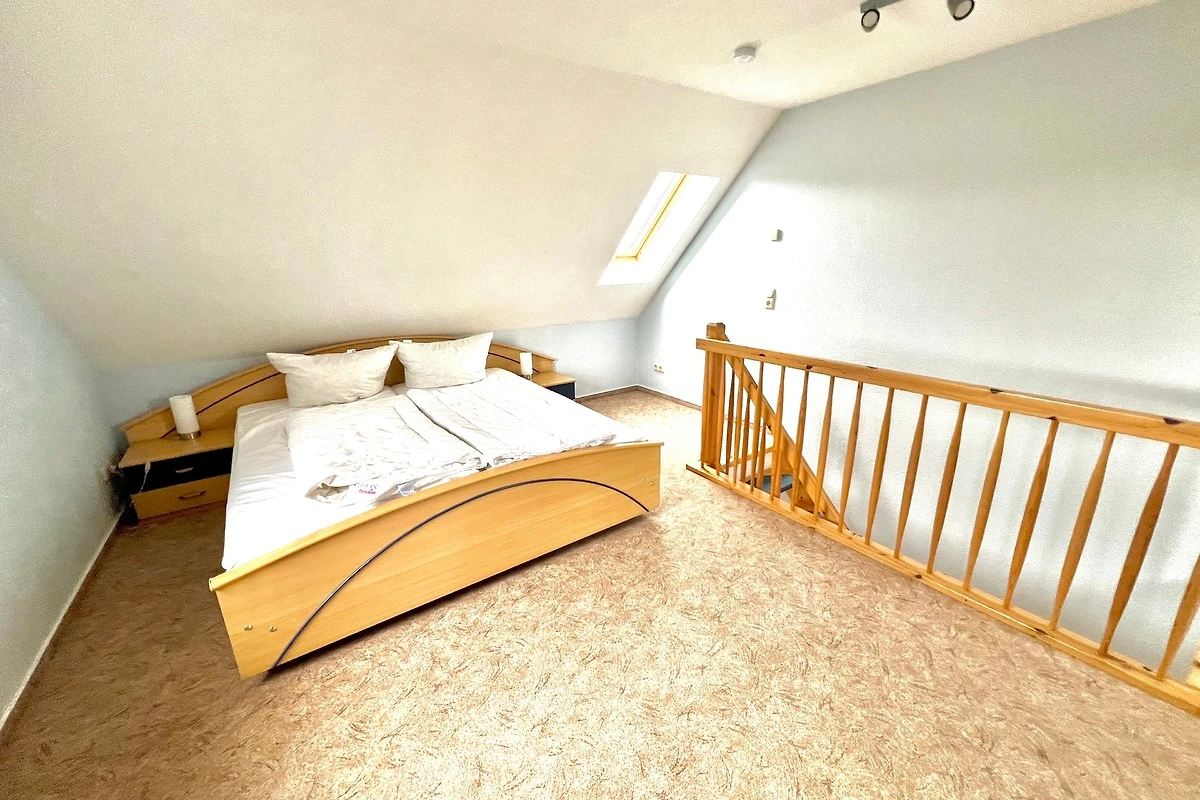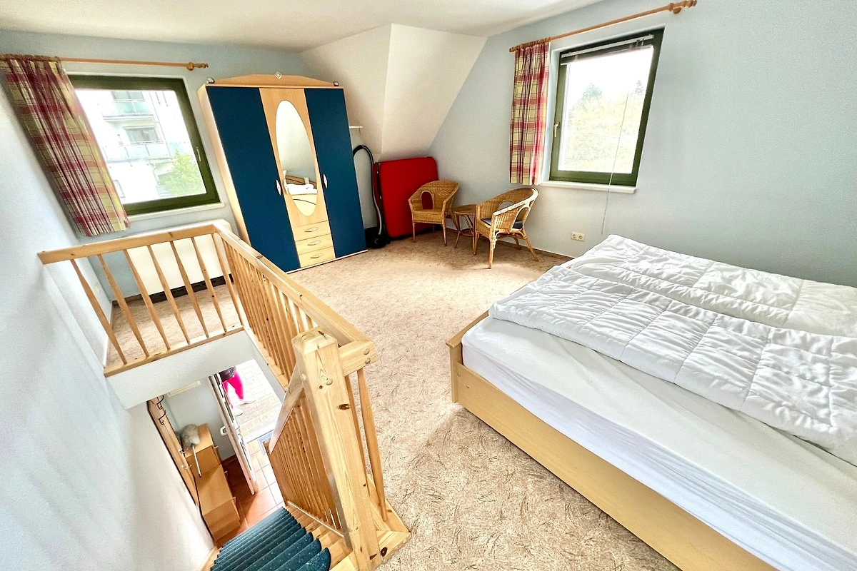 WC mit Duschkabine ist auch unten. Über eine ausreichend breite Treppe geht es in den Schlafbereich. Ein grosszügiges gemütliches Doppelbett und ein bei Bedarf aufklappbares Einzelbett warten hier auf Sie.