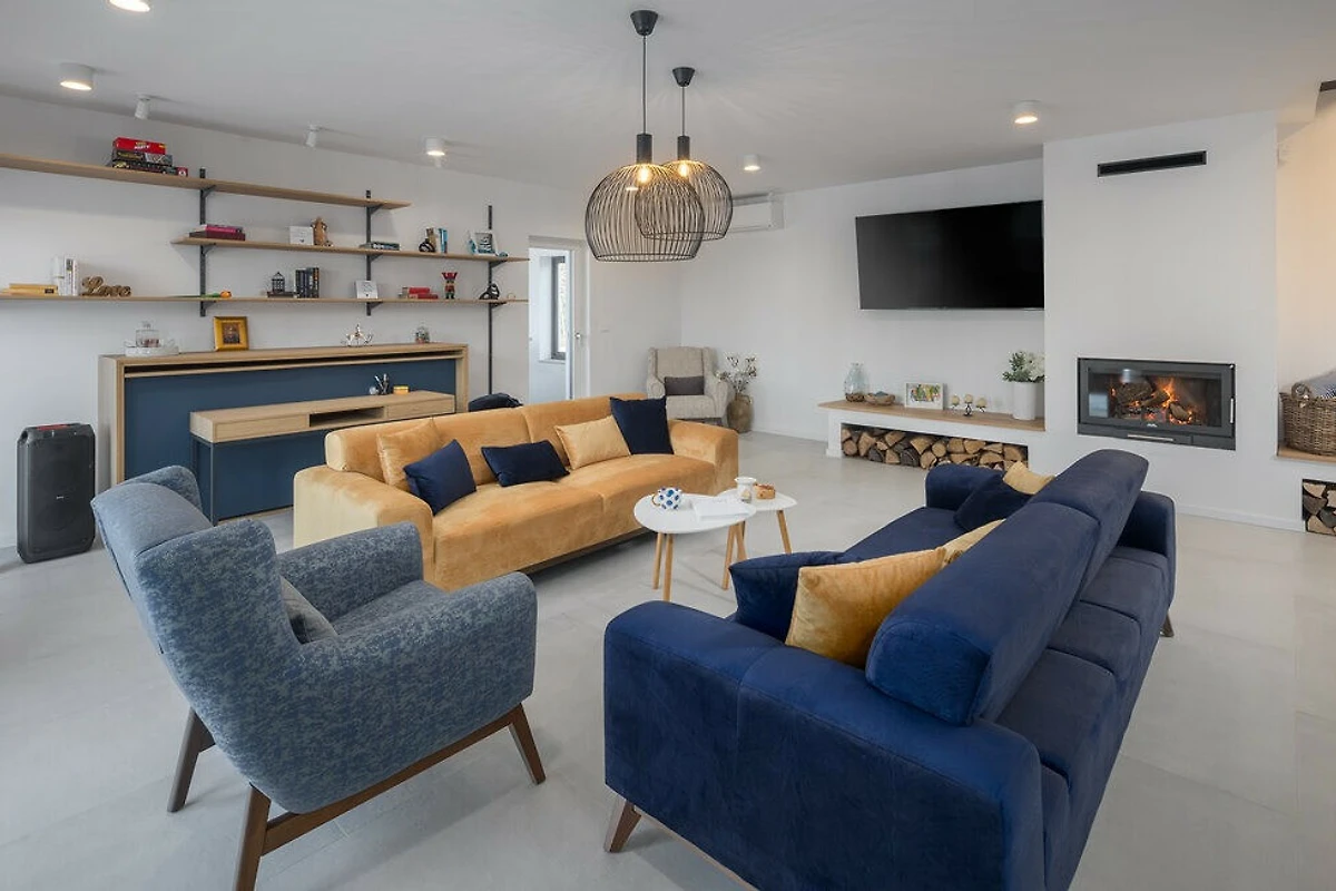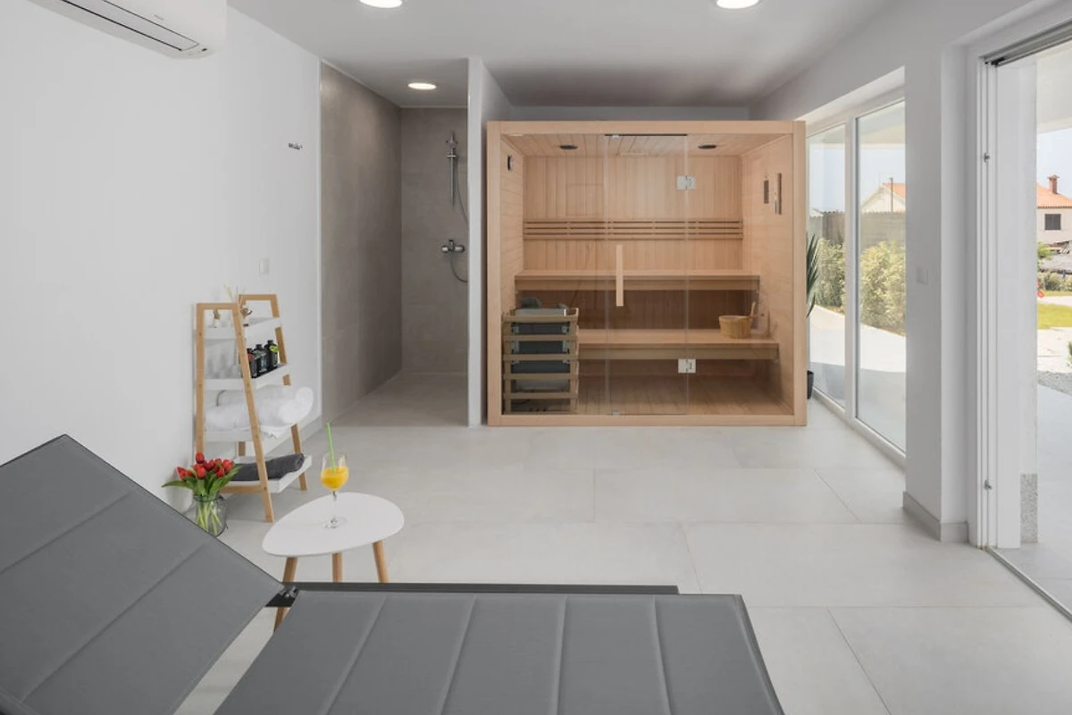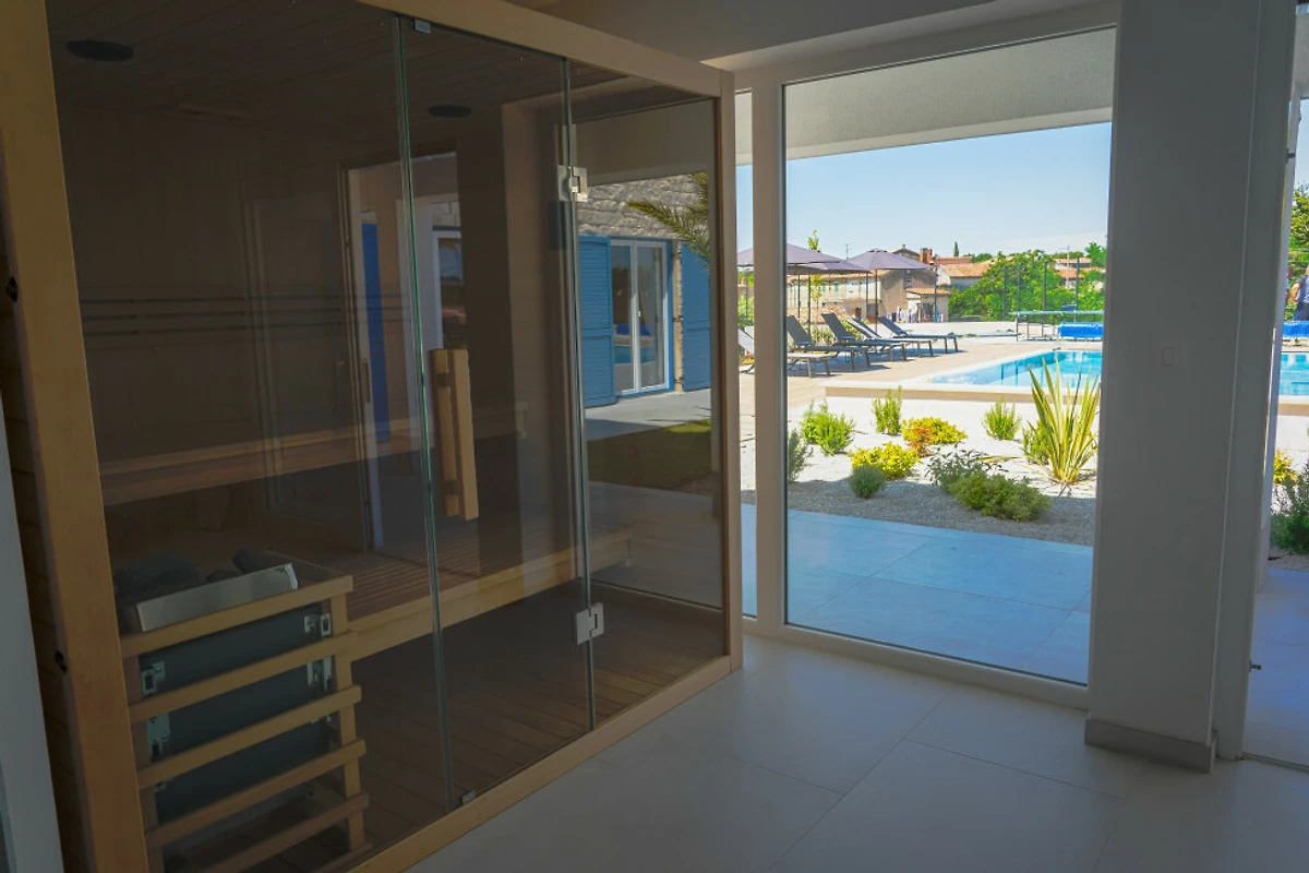 Luxusausstattungen umfassen eine Sauna, einen Spa-Bereich und einen Whirlpool und bieten ultimative Entspannung. Die Villa verfügt über Zentralheizung und Klimaanlage und gewährleistet Komfort in allen Jahreszeiten. Zusätzliche Annehmlichkeiten sind WLAN, ein Bügeleisen und ein gemütlicher Kamin für kühlere Abende.