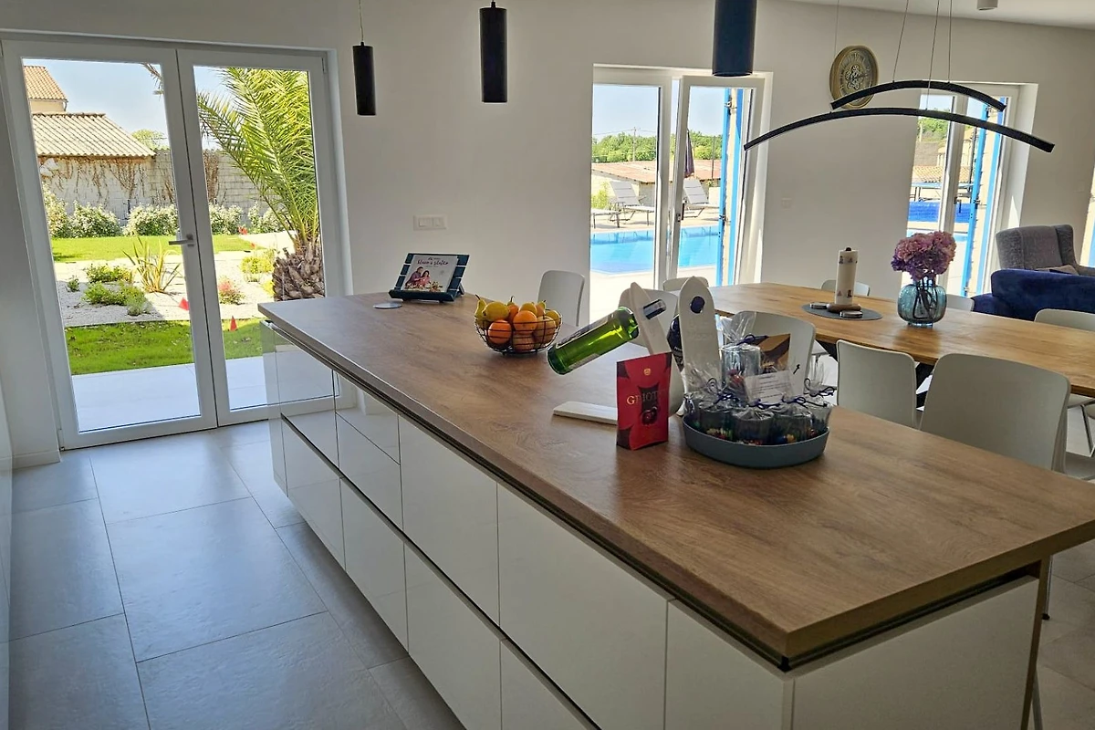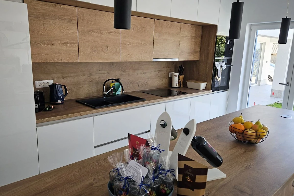 Das Herzstück der Villa ist ihre voll ausgestattete amerikanische Küche mit modernem Induktionskochen und einer umfassenden Auswahl an Geräten, darunter Kühlschrank, Gefrierschrank, Geschirrspüler, Ofen, Mikrowelle, Kaffeemaschine und essentielles Küchengeschirr. Zwei Fernseher mit Satellitenkanälen sorgen für Unterhaltung der Gäste.
