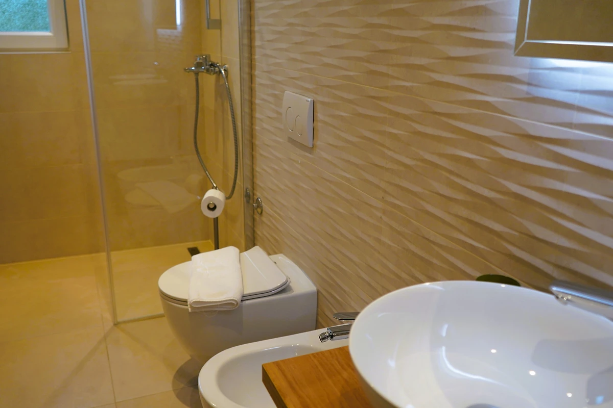 Die Villa verfügt über beeindruckende 4 Badezimmer und bietet reichlich Platz und Komfort für alle Gäste. Zwei Badezimmer verfügen über moderne Duschen, eines bietet eine luxuriöse Badewanne, und eine zusätzliche Toilette sorgt für Komfort für jeden. Die voll ausgestattete amerikanische Küche ist ein kulinarisches Paradies, komplett mit Induktionskochen, einer umfassenden Auswahl an Geräten, darunter Kühlschrank, Gefrierschrank, Geschirrspüler, Ofen, Mikrowelle, Kaffeemaschine und allem notwendigen Küchengeschirr.