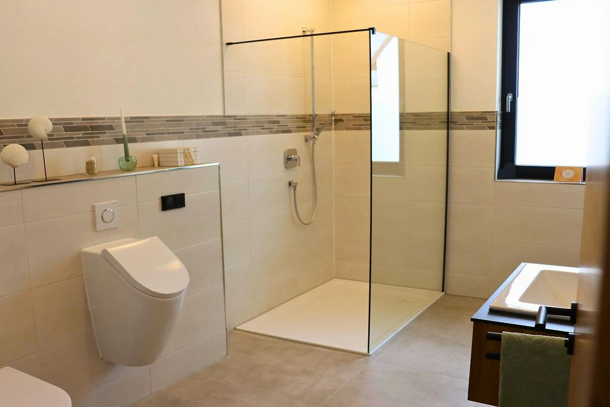 Im Haus erwarten Sie drei Schlafzimmer mit je einem Boxspringbett (3 Doppelbetten) sowie einem Babybett. Zudem stehen zwei moderne Bäder mit Regendusche, WC und Pissoir zur Verfügung. Das Hauptbad bietet zusätzlich eine Badewanne, einen Schminktisch sowie ein Ankleidezimmer mit direktem Zugang zu einem der Schlafzimmer. Das gesamte Haus ist mit Verdunkelungsmöglichkeiten ausgestattet.